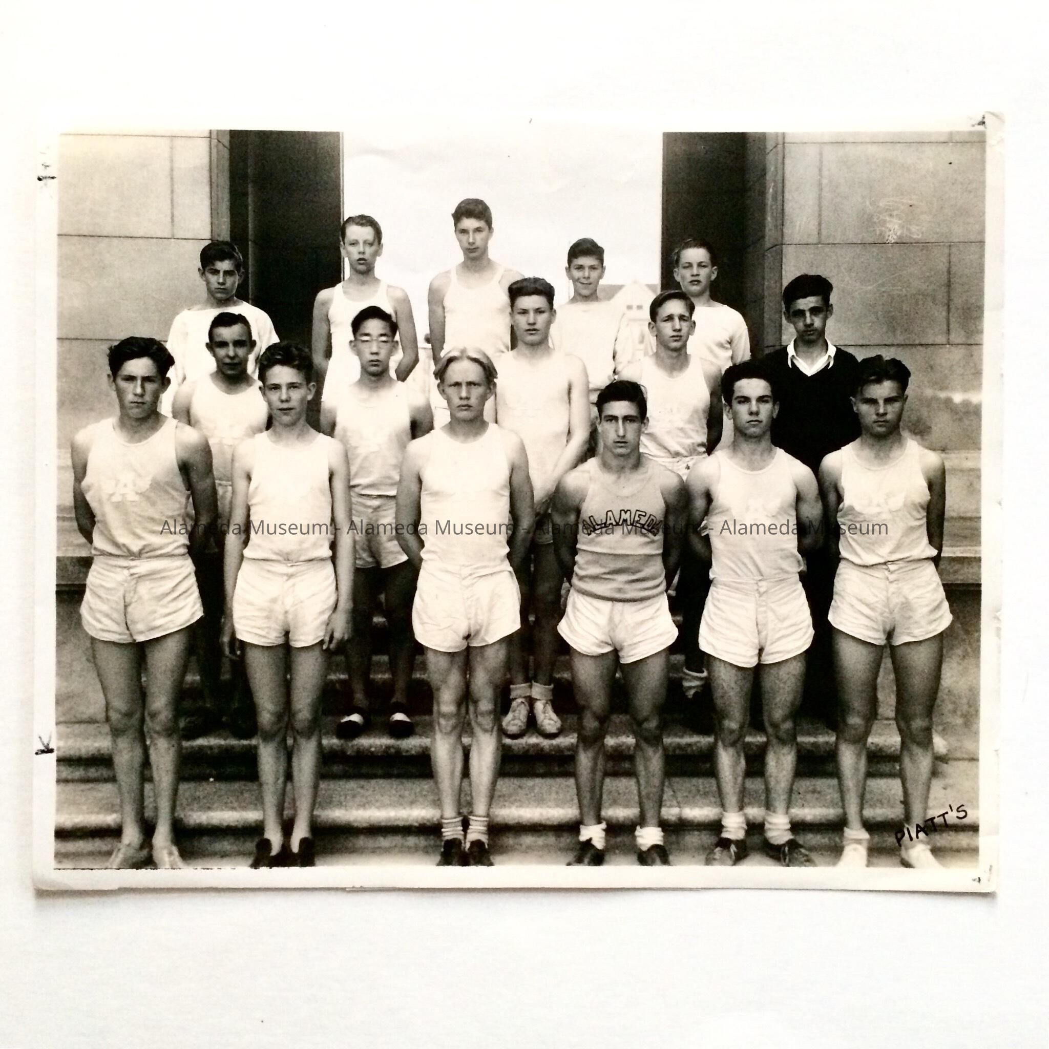 A PHOTO OF TRACK TEAM, CLASS "B," ALAMEDA HIGH SCHOOL. TEAM MEMBERS ARE PICTURED IN TRACK TEAM UNIFORMS ON WHICH THE LETTER "A" APPEARS IN BLOCK FORM.