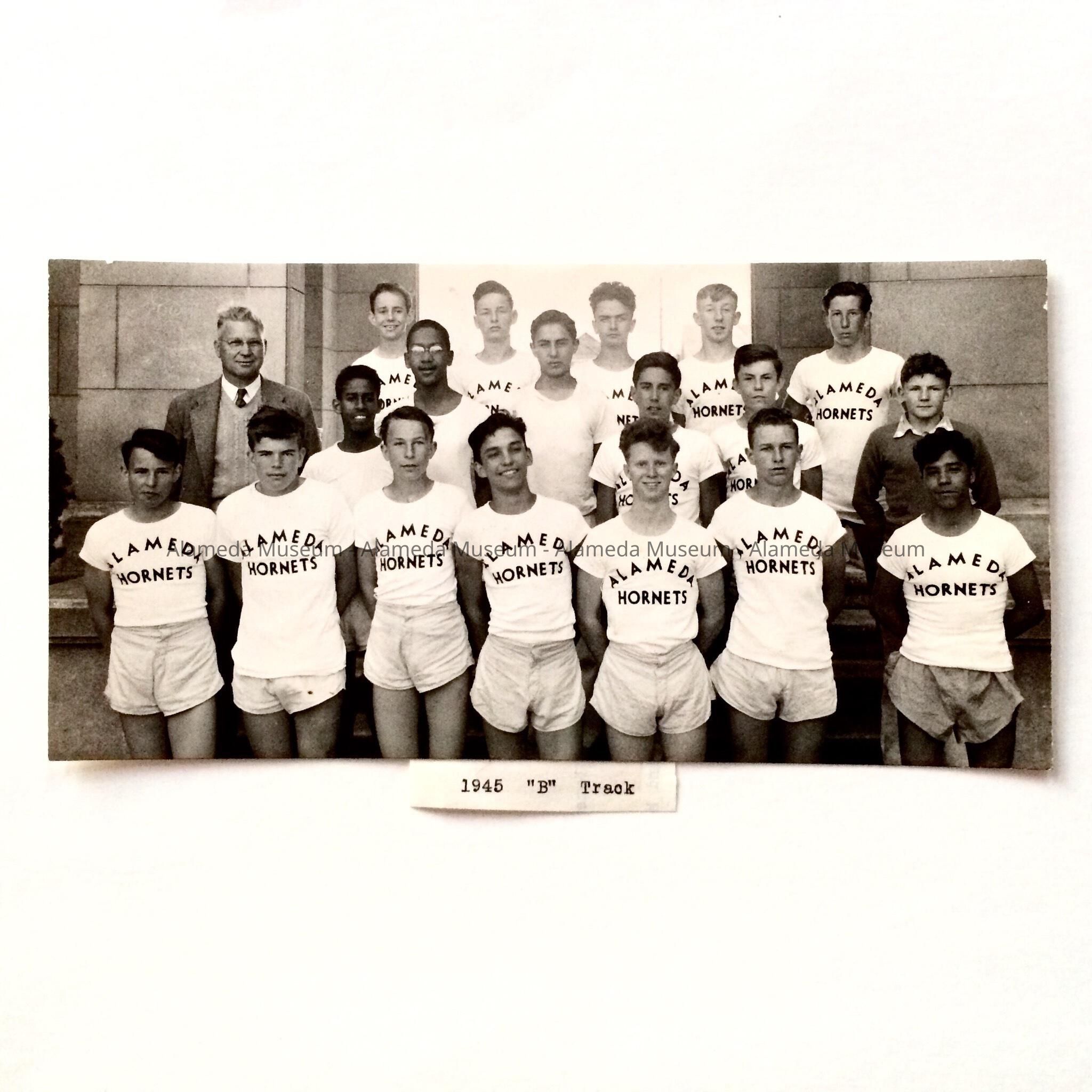A PHOTOGRAPH OF A GROUP OF BOYS WEARING TEE SHIRTS, WITH "ALAMEDA HORNETS," PRINTED THEREON. THEY WERE MEMBERS OF TRACK "B" OF THE ALAMEDA HIGH SCHOOL TRACK TEAM. THEY ARE SHOWN ACCOMPANIED BY THEIR COACH, LEWIS C JOLLEY.
