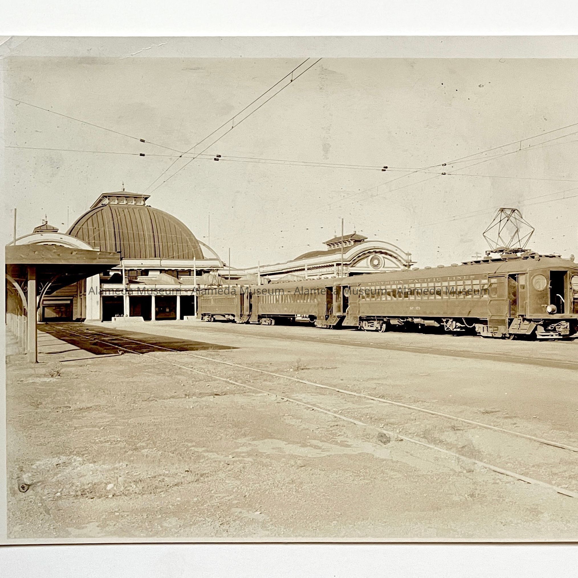History of Object: View of the Alameda Mole showing railway passenger cars in the foreground.