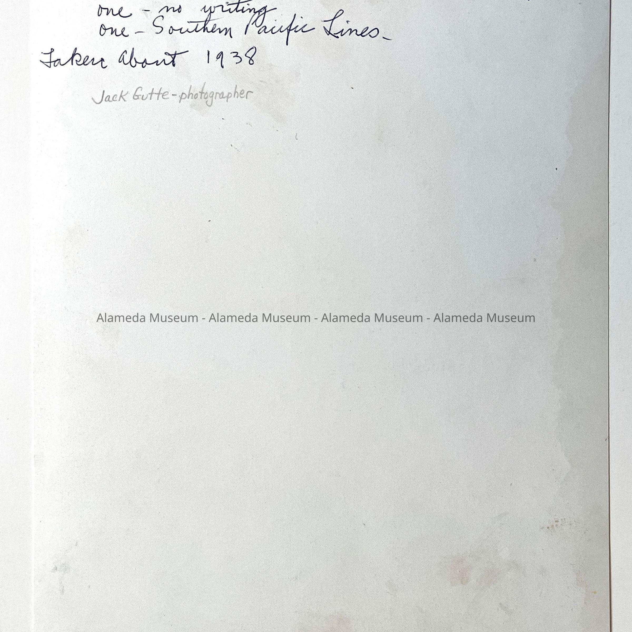 Description: Glossy black/white photo with yellowish toning. Photographer: Jack Gutte, Alameda. Upper left and right corners are damaged.