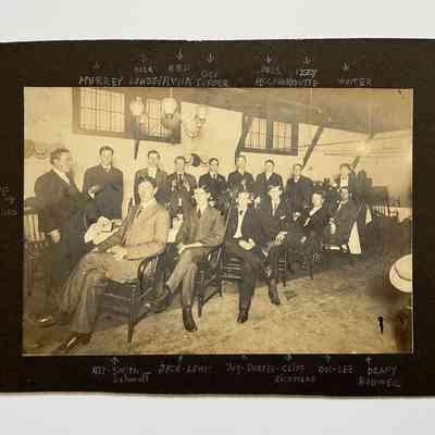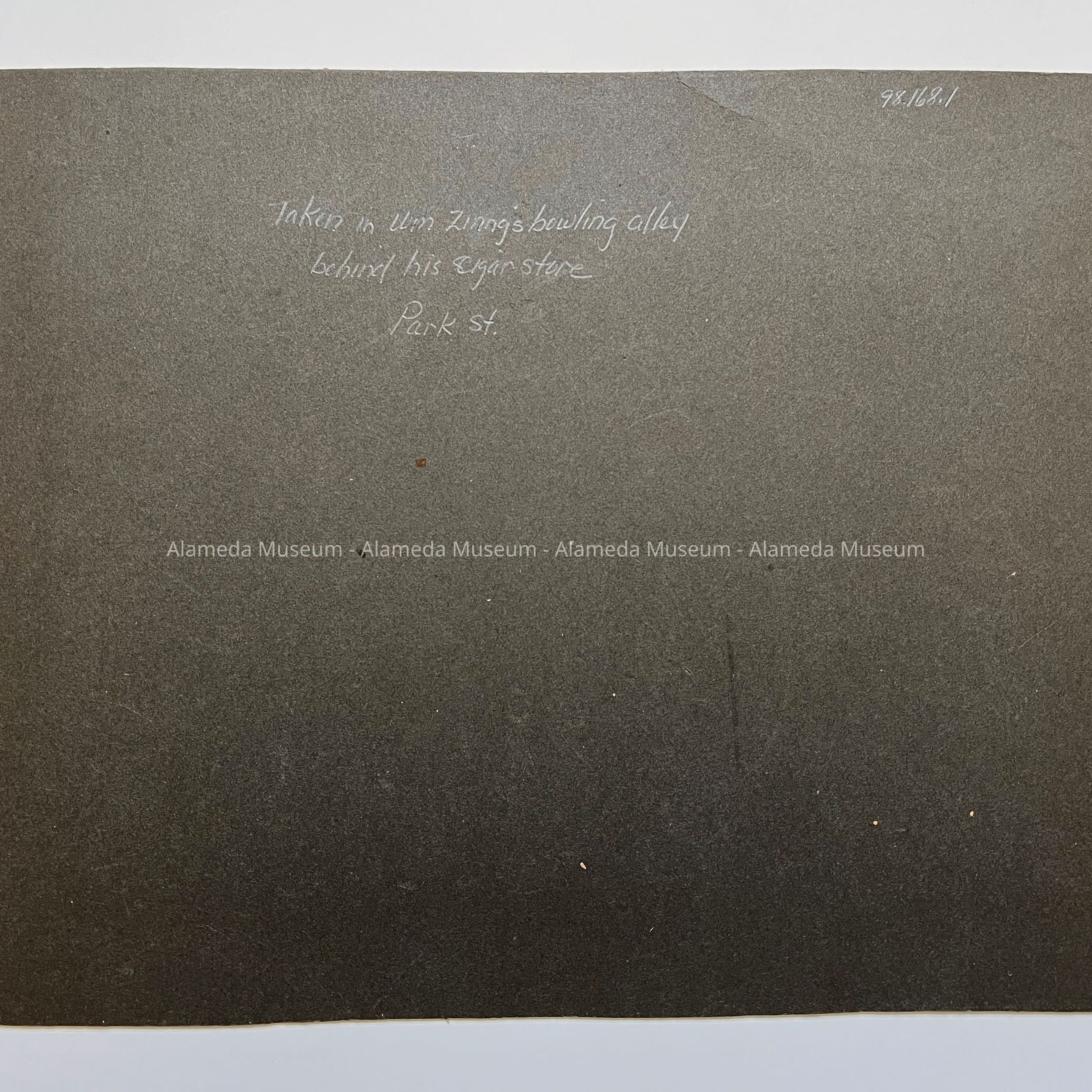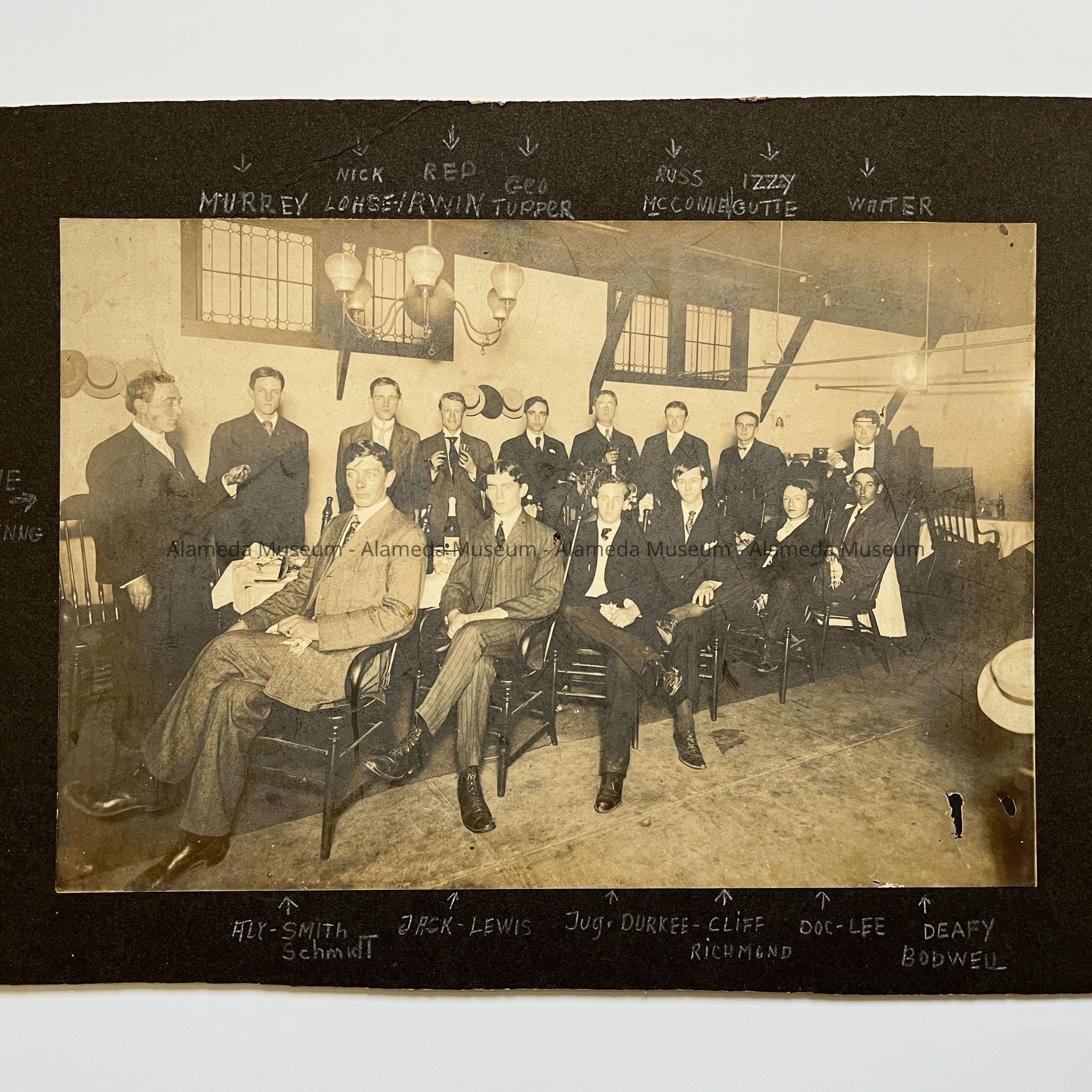 PHOTOGRAPH OF A GROUP OF GENTLEMEN, INCLUDING THE DONOR'S FATHER, WALTER LEE, TAKEN IN THE BOWLING ALLEY OF WILLIAM ZINNG CIGAR STORE, PARK STREET, ALAMEDA, CALIFORNIA. THE BOWLING ALLEY WAS LOCATED IN THE REAR PORTION OF THE BUILDING. MR. LEE WAS A MEMBER OF THE ALAMEDA ALERTS BASEBALL TEAM, AND WAS WELL KNOWN IN ATHLETIC CIRCLES.
