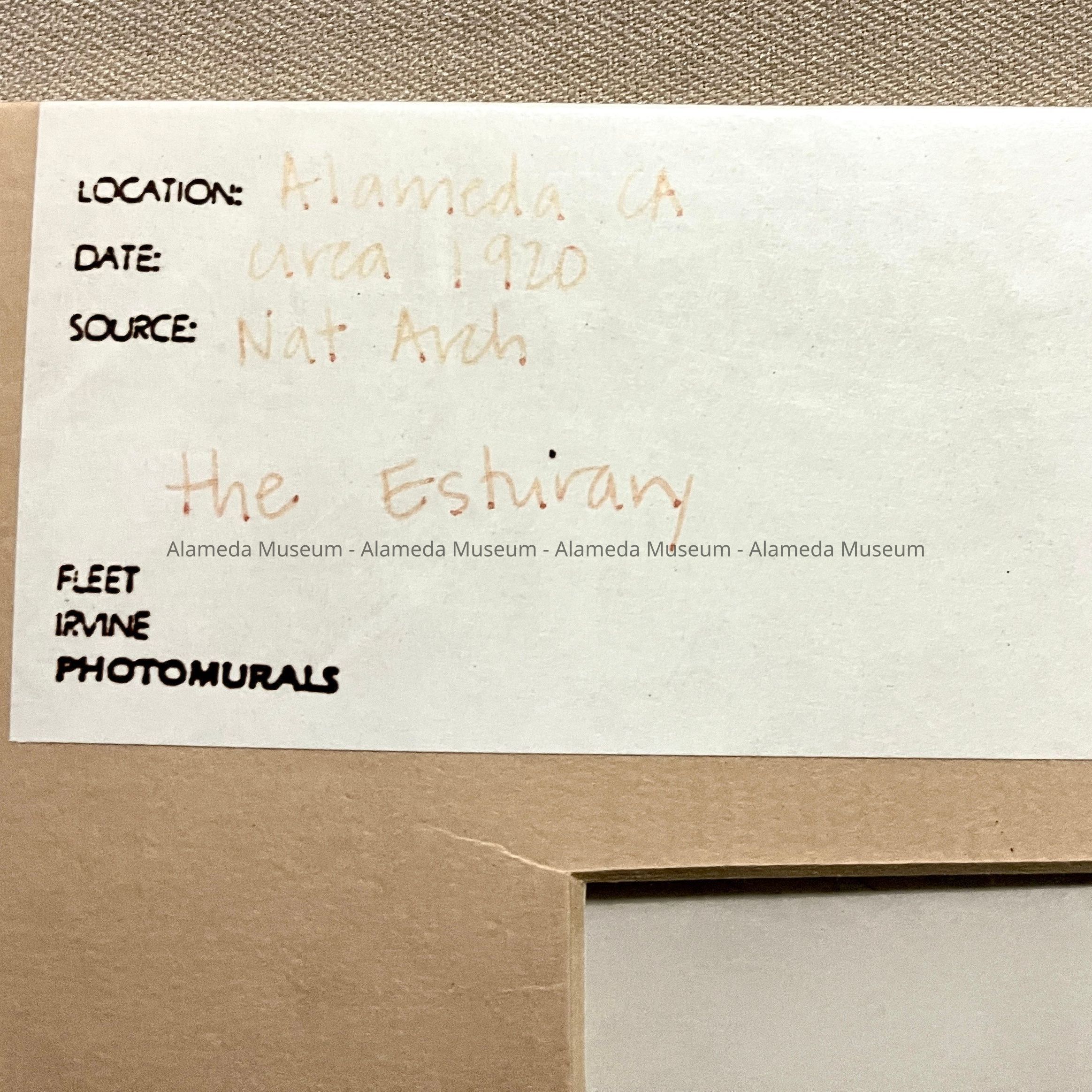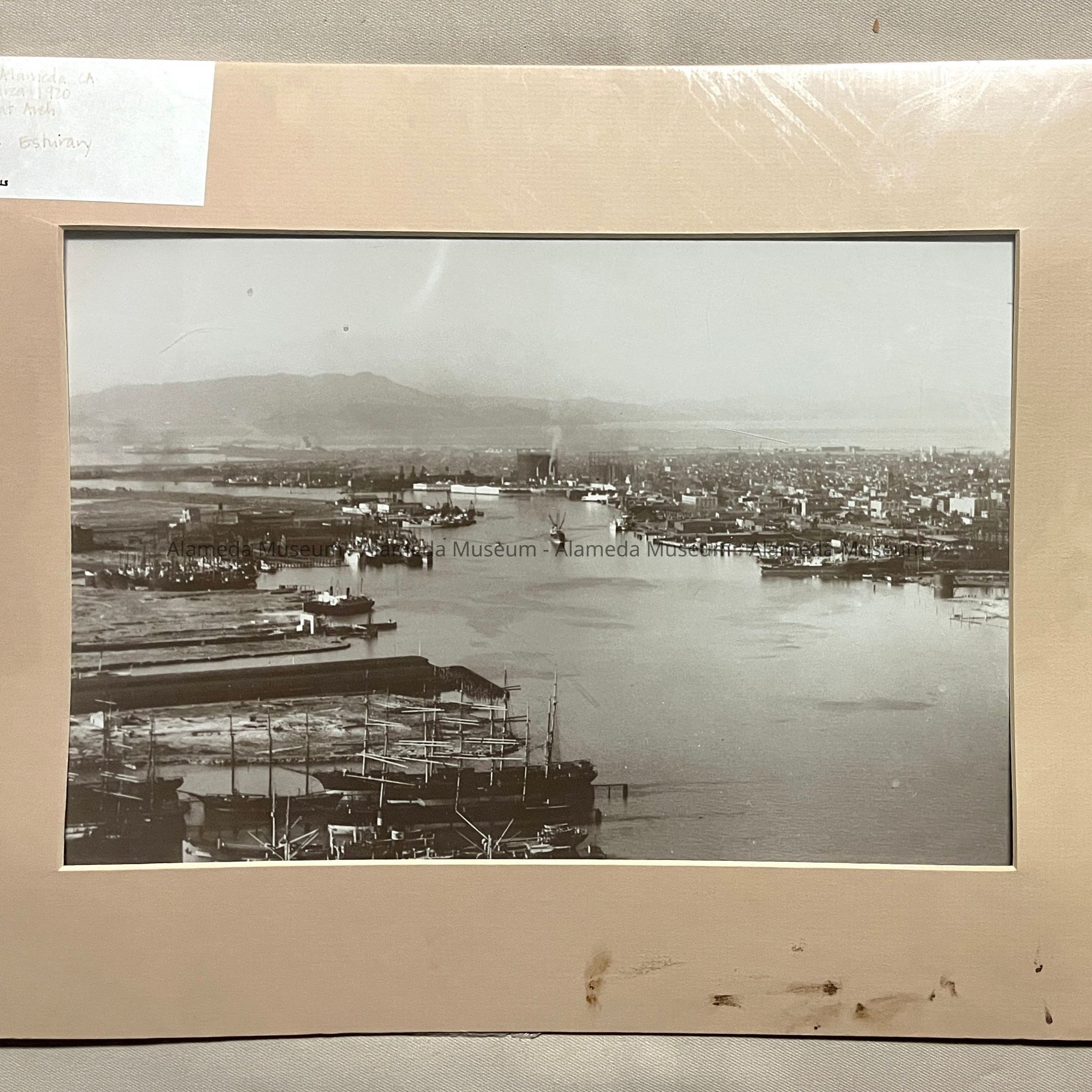 HISTORY OF OBJECT: A PHOTO DEPICTING THE OAKLAND AND ALAMEDA ESTUARY LOOKING TOWARD SAN FRANCISCO BAY, IN THE FOREGROUND ARE SAILING SHIPS FROM THE ALASKA FLEET.