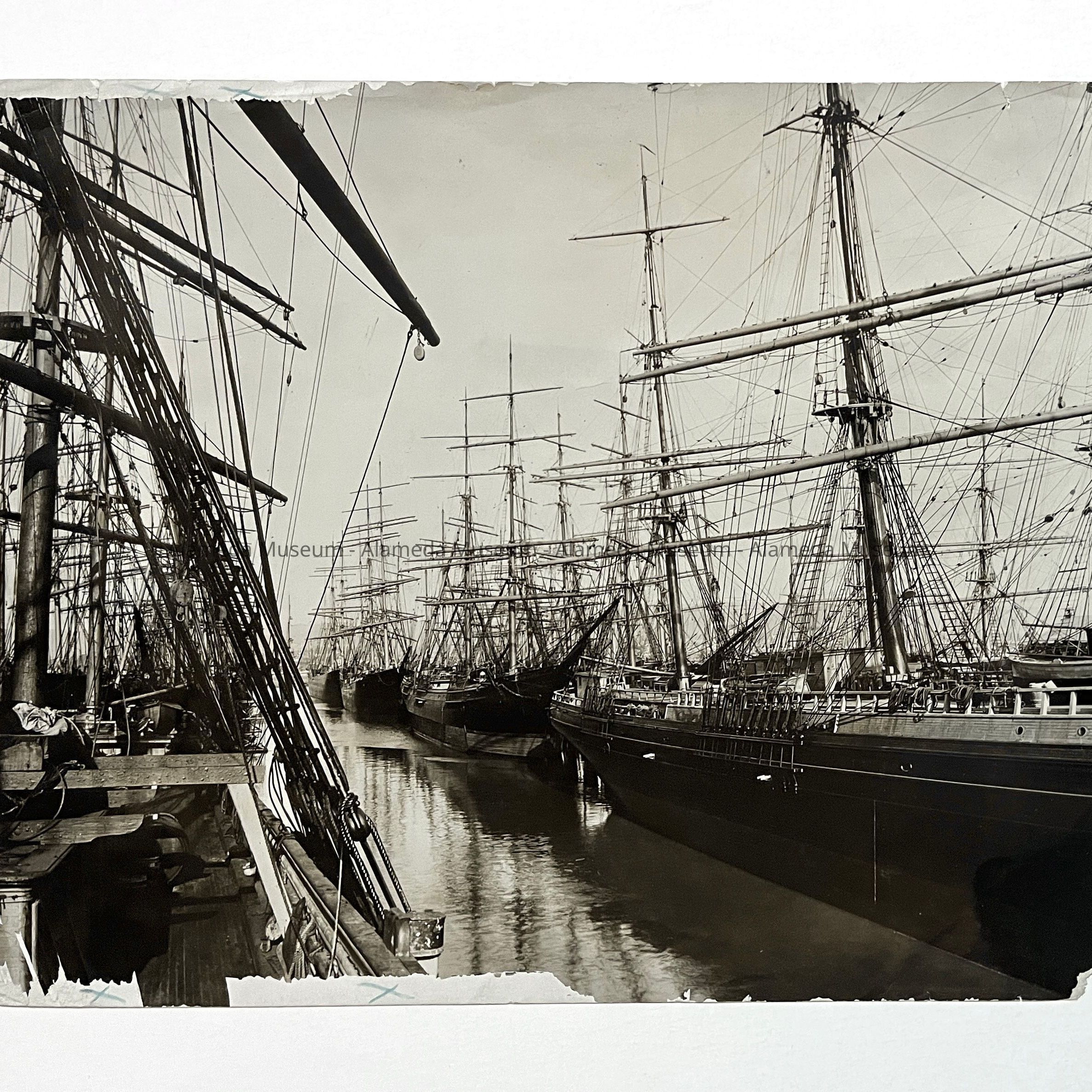 History of Object: View of the Alaska Packers vessel "Tacoma" docked amidst several sister ships in the Estuary, in February, 1912.