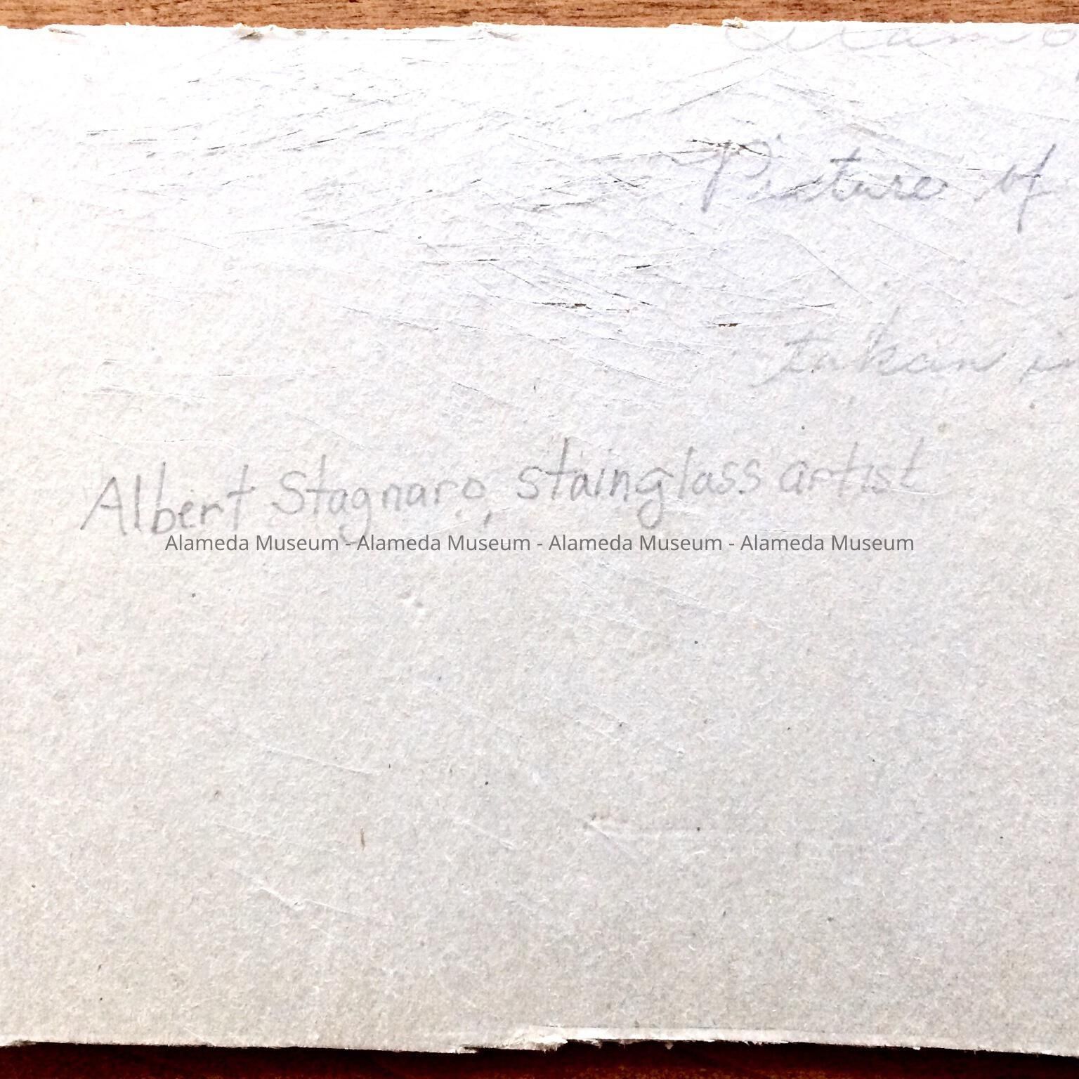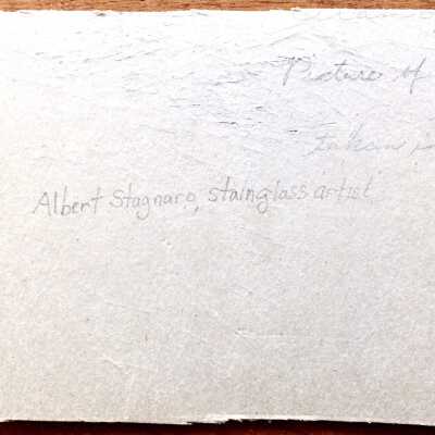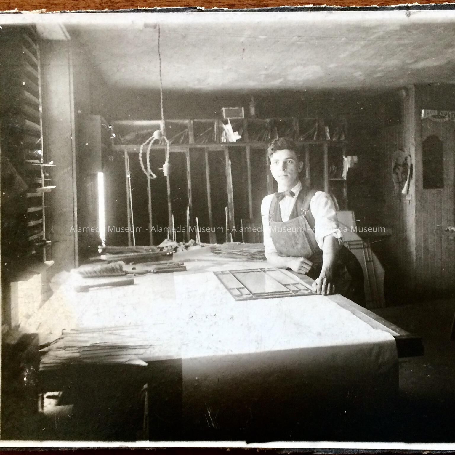 History of Object: A photograph of Albert Stagnaro at a work bench completing a stained glass window project.