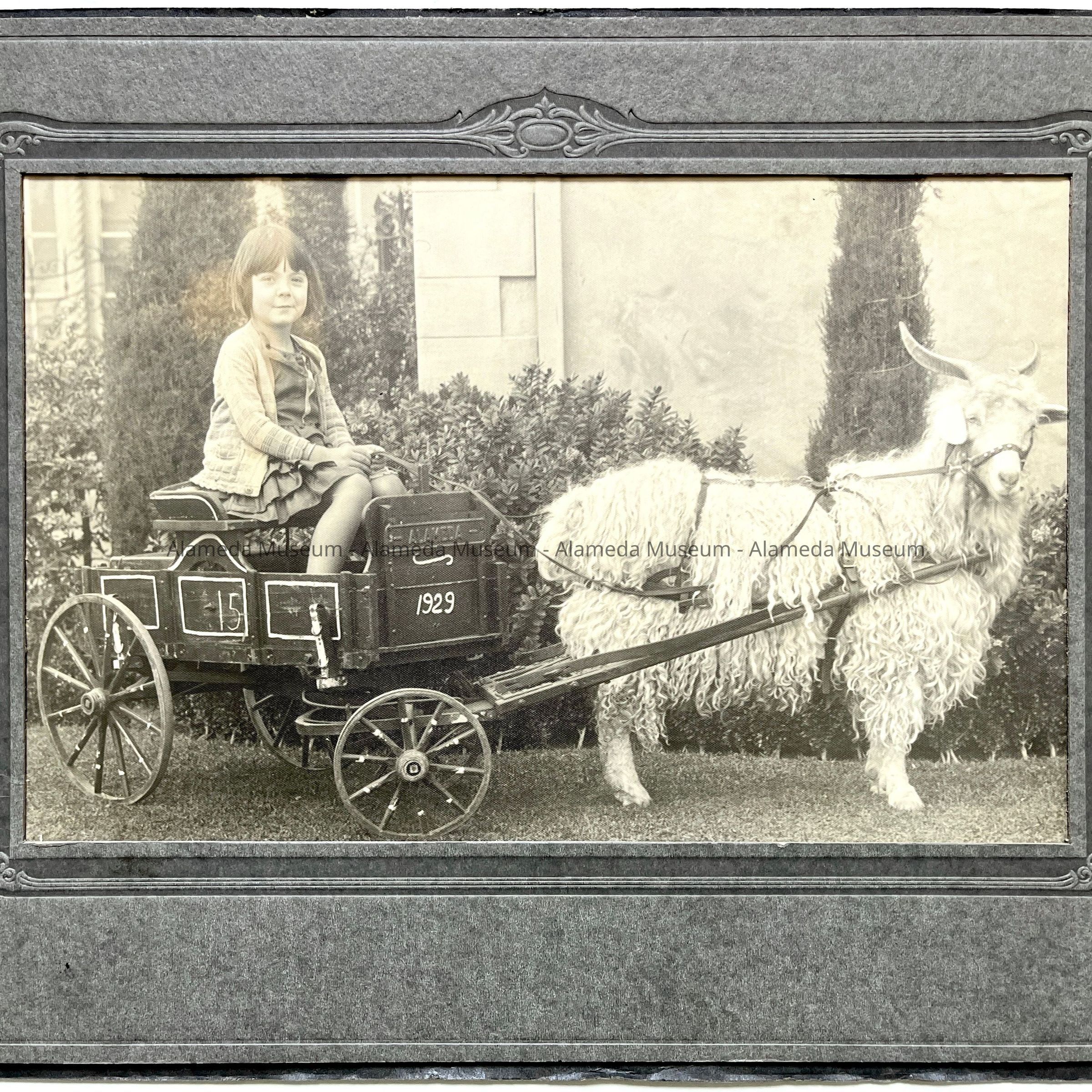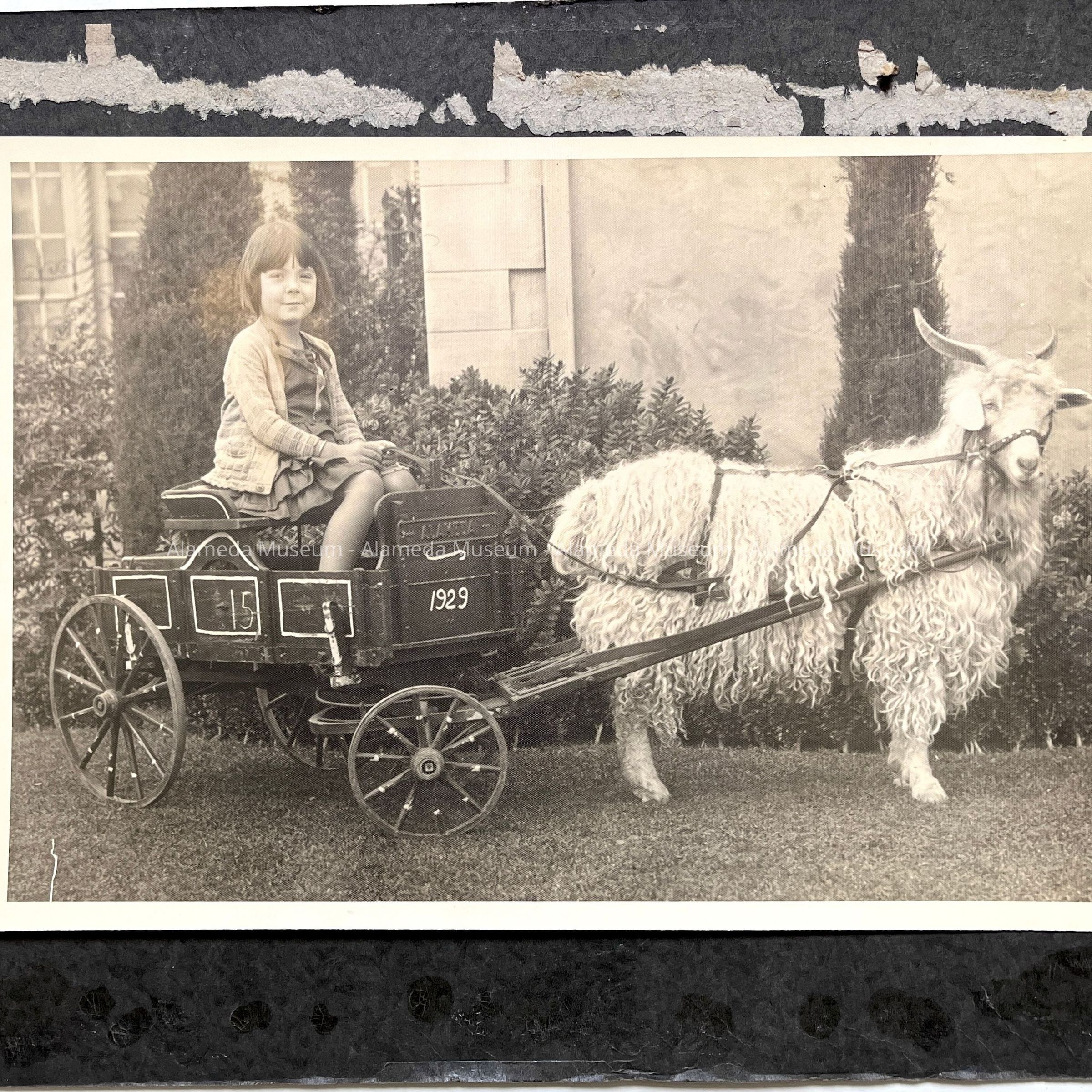 History of Object: A photograph of little Alrita Stagnaro, about five years old, seated within the goat-driven cart of an itinerant photographer, posed in front of the Stagnaro residence located at 1701 Cambridge St., Alameda.