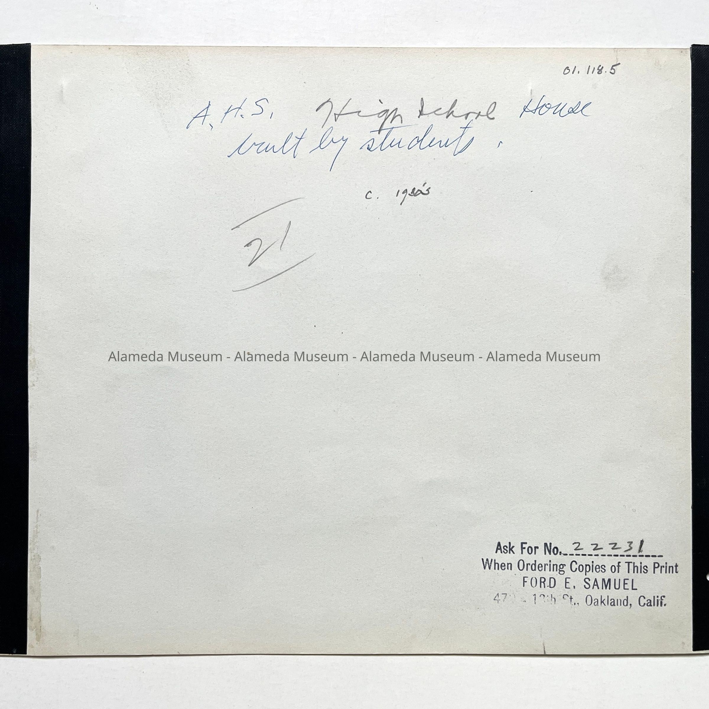 Description: Glossy black/white photo, unmounted. Photographer: Ford E. Samuel, Oakland. Black reinforcement tape appears along the left margin through which two holes are punched.