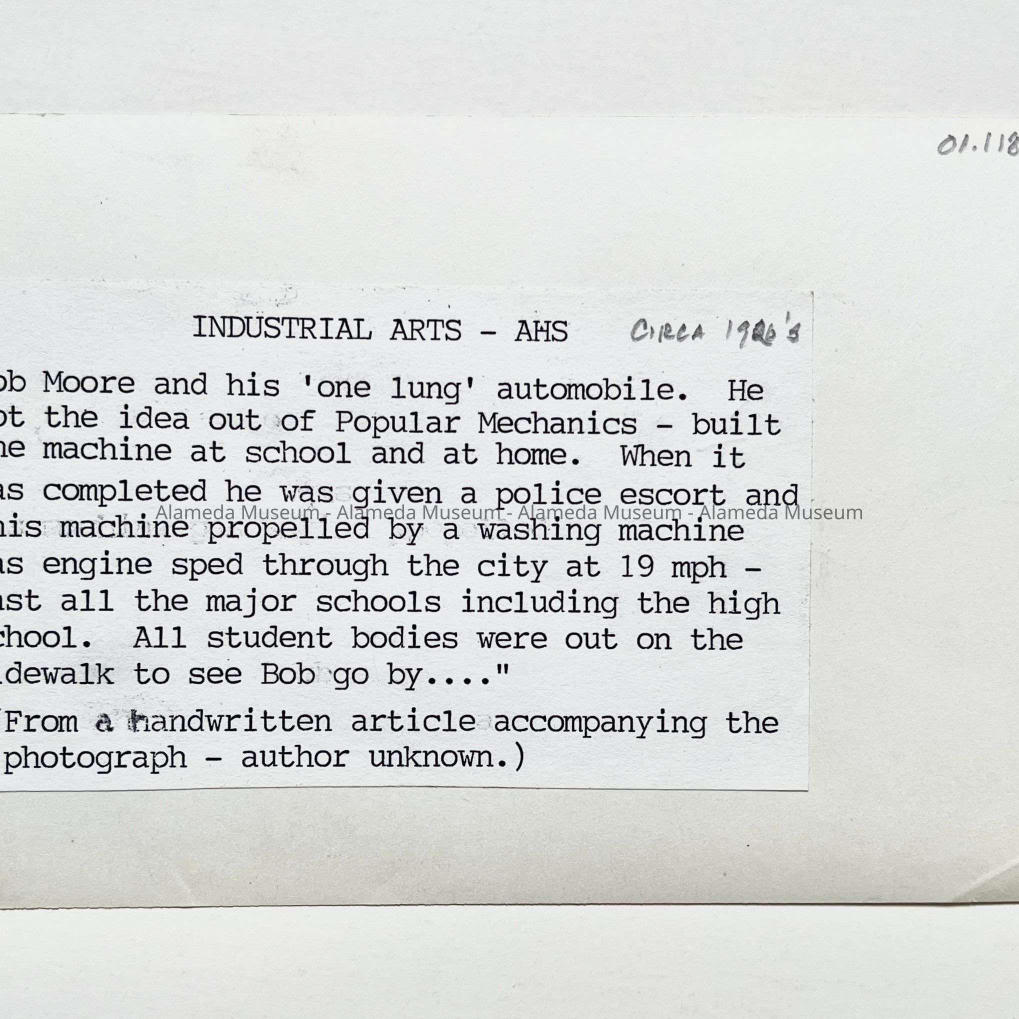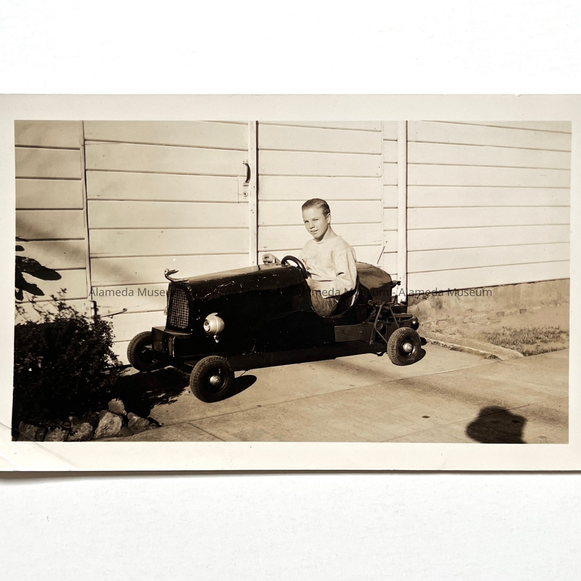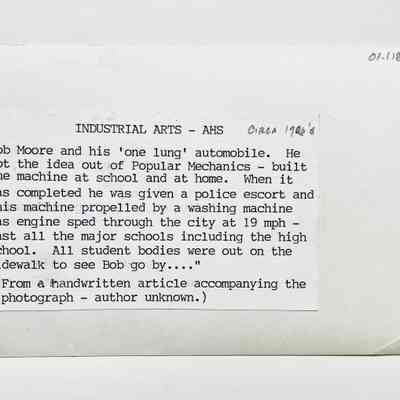 History of Object: AHS student BOB MOORE shown in his "one lung" automobile which he constructed at school and at home. It was propelled by a washing machine gas engine and according to an account on the image's verso, created quite a local sensation.