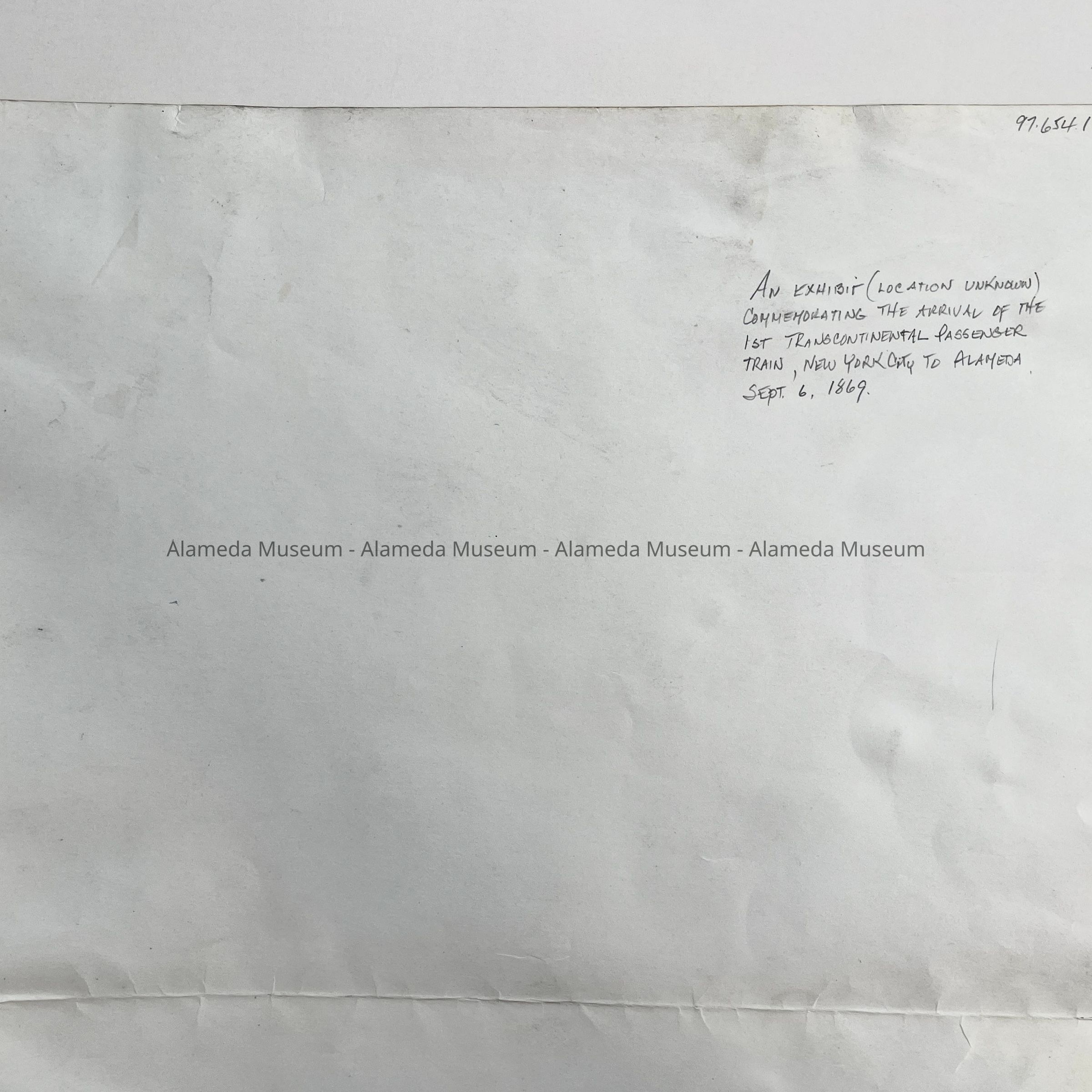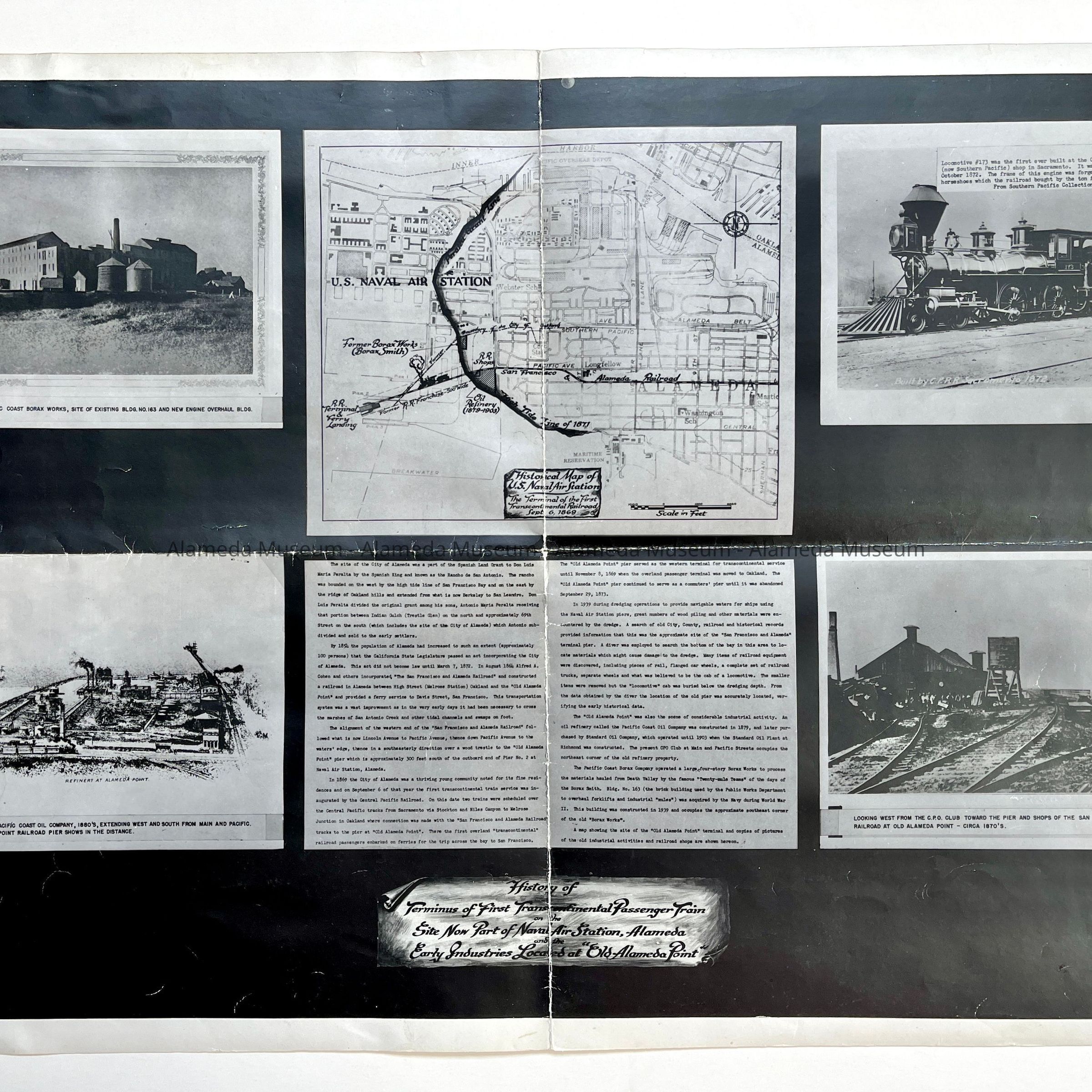 History of Object: Photograph of an exhibit (location unknown) that featured photographs, an engraving, a map, and typewritten descriptive material connected with the history of the terminus of the 1st Transcontinental Passenger Train site at old Alameda Point, later part of the Naval Air Station.