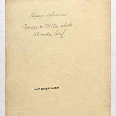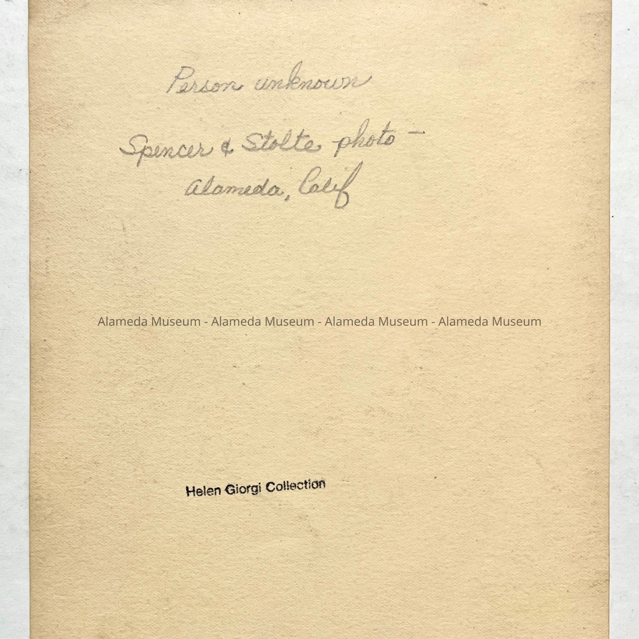 Description: Black & white photo, signed in script "Misses Spencer & Stolte, Alameda." Size: L-7 3/4 X W-4 3/4 inches.