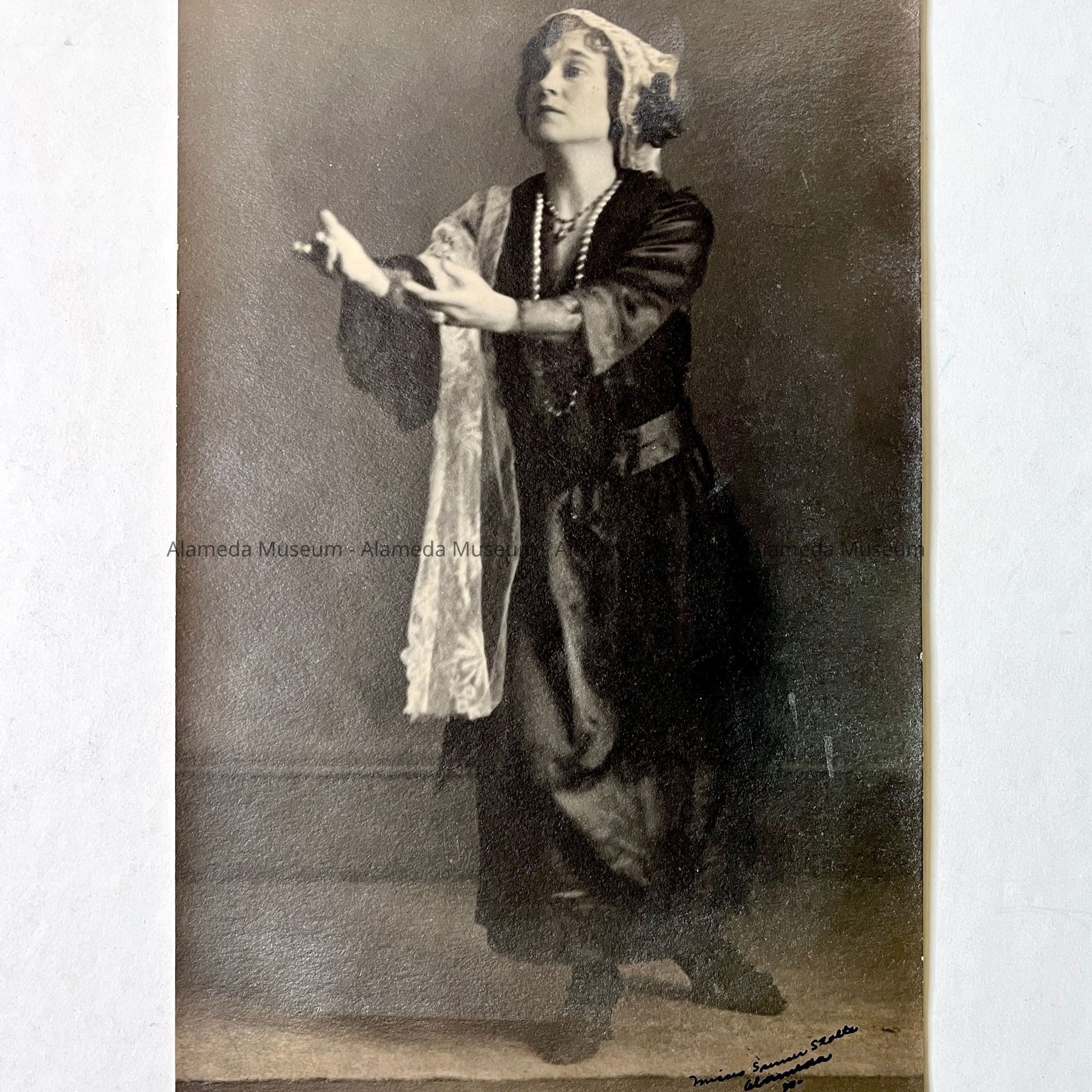 History of Object: Photo of an unidentified lady (actress) in theatrical pose taken by the noted female photographers of Alameda- Spencer & Stolte.