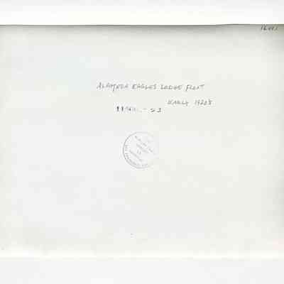 HISTORY OF OBJECT: A PHOTO OF "ANDERSON'S FLOAT" WITH THE CAPTION, "ALAMEDA, THE DAHLIA CITY." A PAPER SIGN STATES, "ALAMEDA 1076." THE FLOAT IS A CAMOUFLAGED TRUCK WITH DRIVER AND PASSENGERS. LOCATION OF THE FLOAT IS PROBABLY OAKLAND.