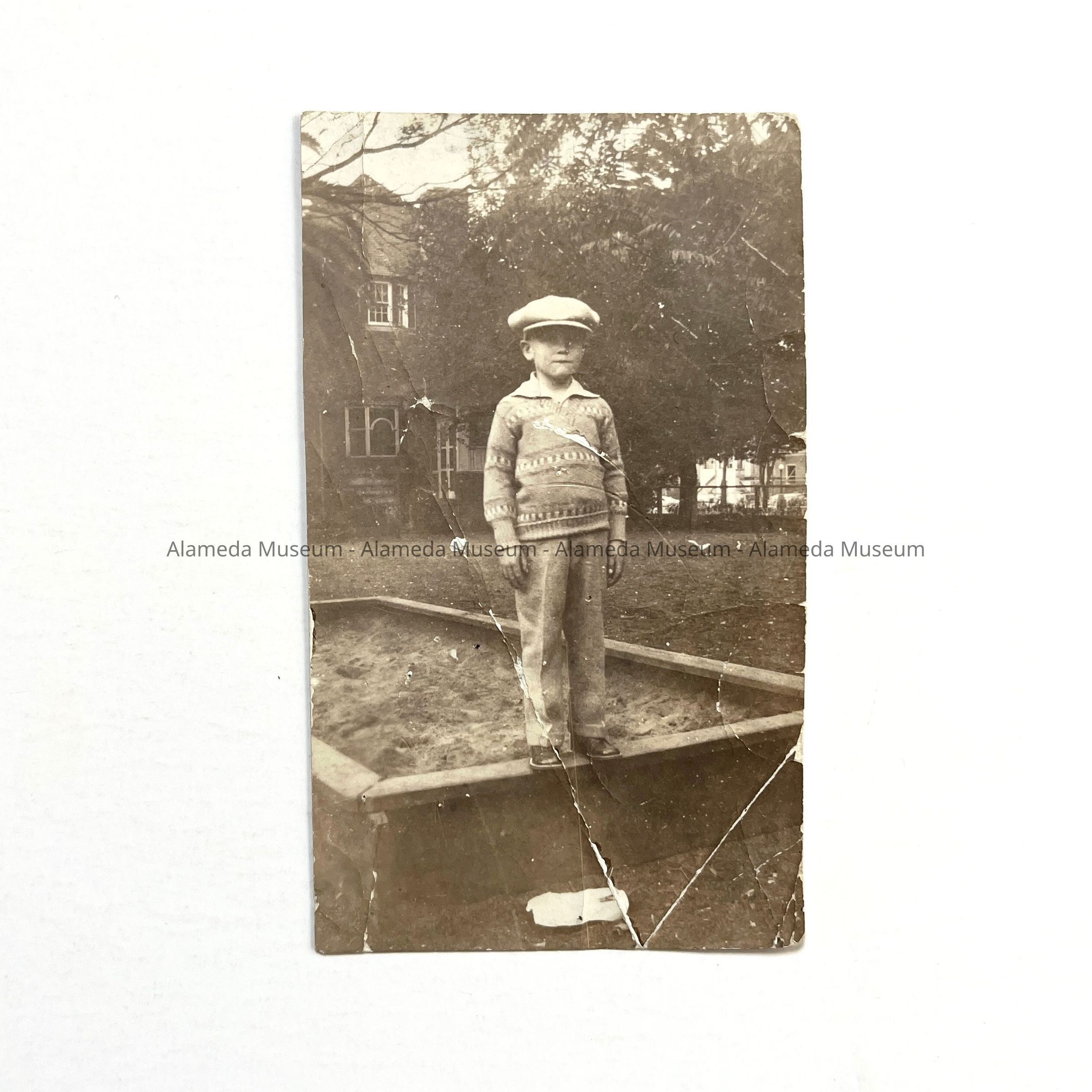 History of Object: View of a young boy standing on the edge of a sand box at the Lona Hazzard private school located on Santa Clara Avenue. The young boy is Arthur Robert "Bob" Matthiesen (1918-2006), brother of the donor.