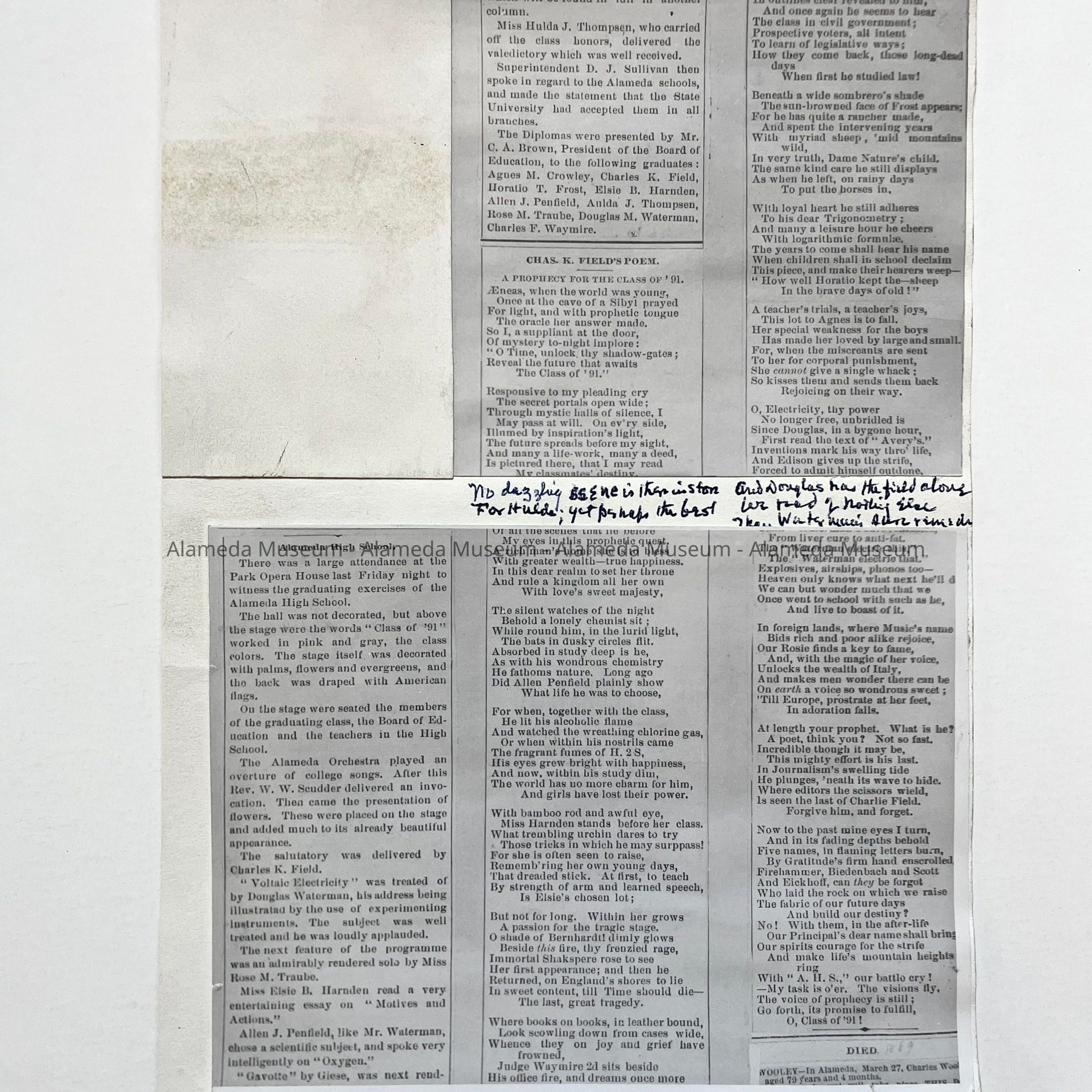 Photo of article about Alameda High School (Haight) graduating ceremony, 1891Entry/Object ID