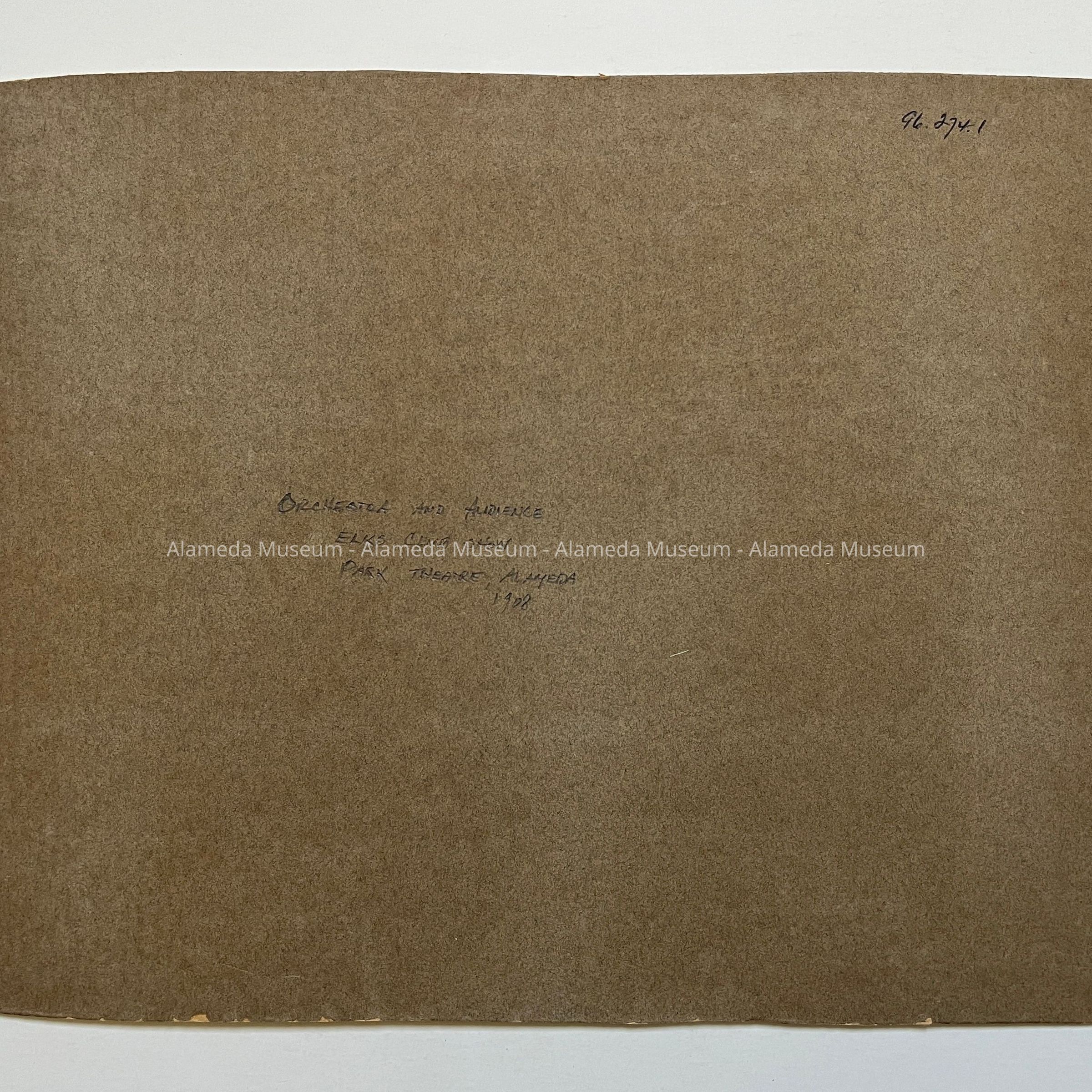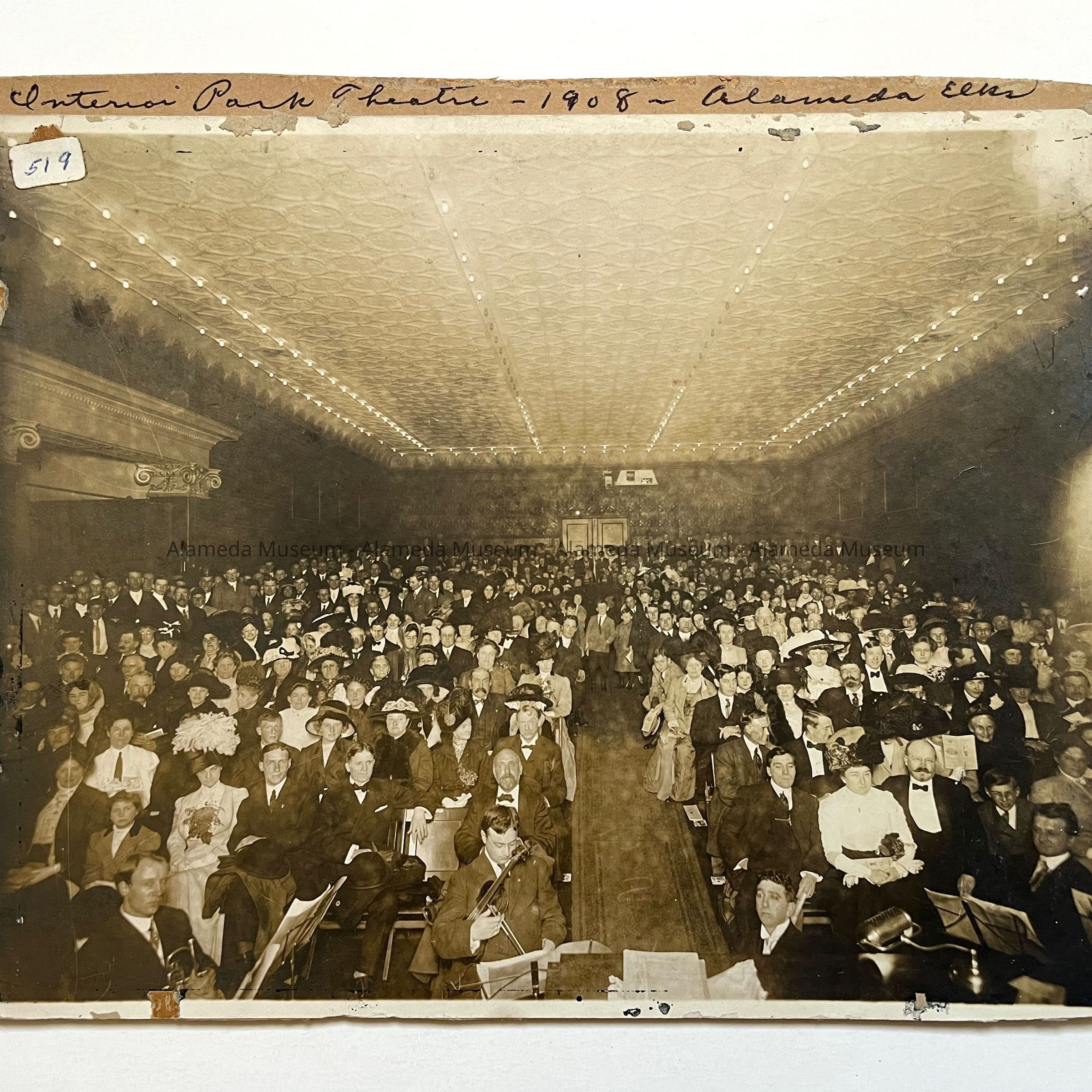 History of Object: View of the orchestra and audience taken from the stage at the Elks Club show at the Park Theatre, Alameda, 1908.