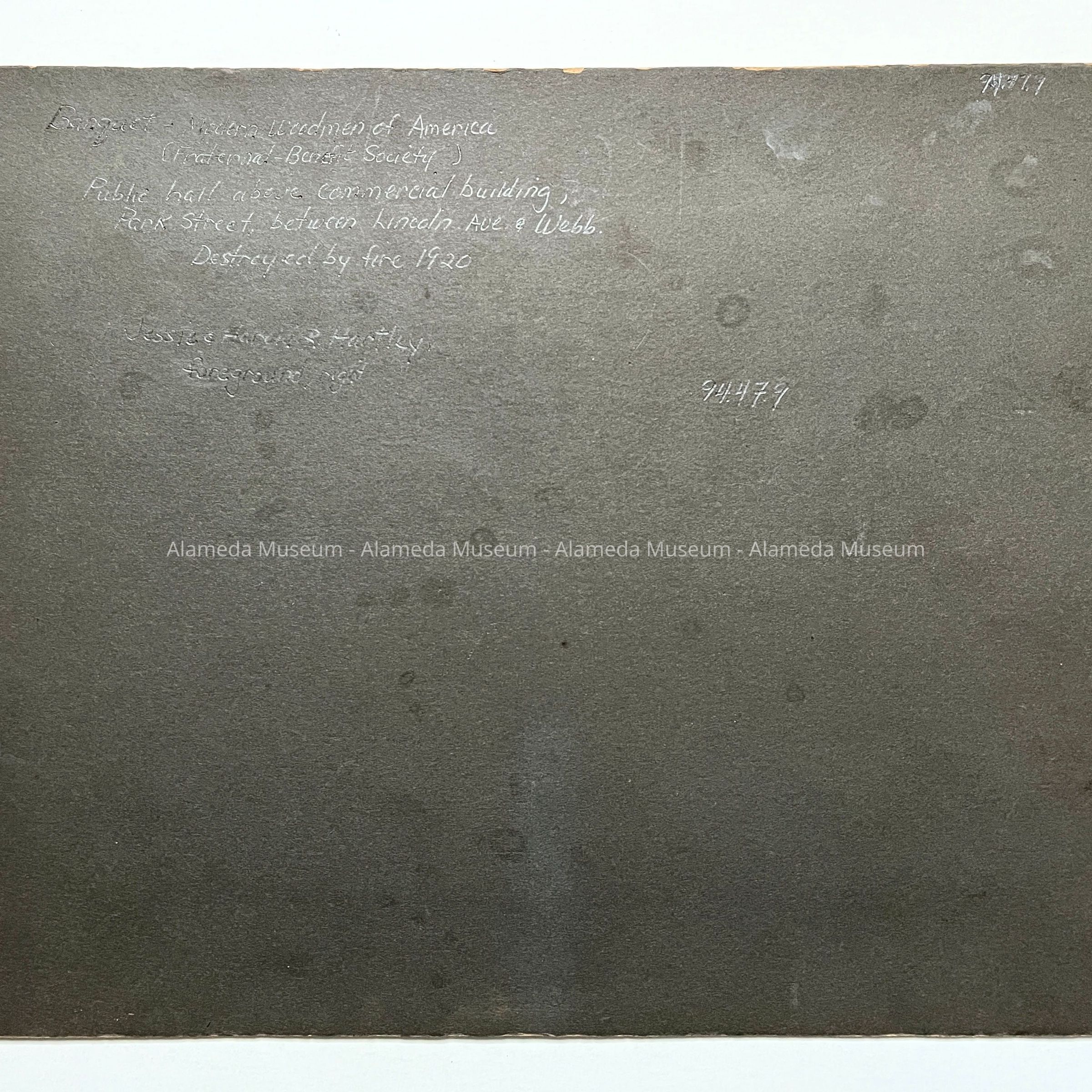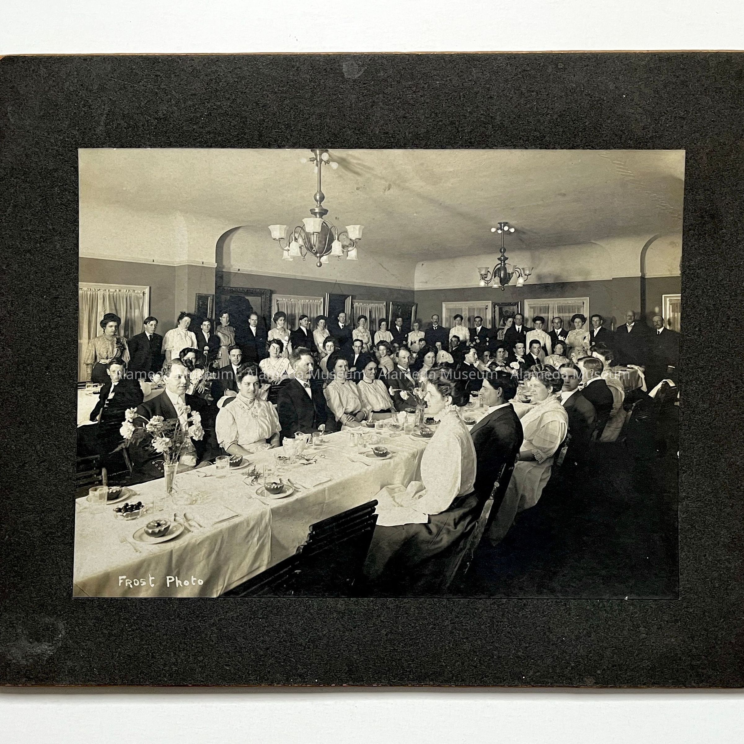 Photograph depicting banquet of the Modern Woodmen of America, Fraternal Benefit Society. Group photograph taken in a public hall above a commercial building on Park St., between Lincoln and Webb Ave. The building was destroyed by fire in 1920. The donors' parents, Harold R. and Jessie Hartley are pictured in the foreground.