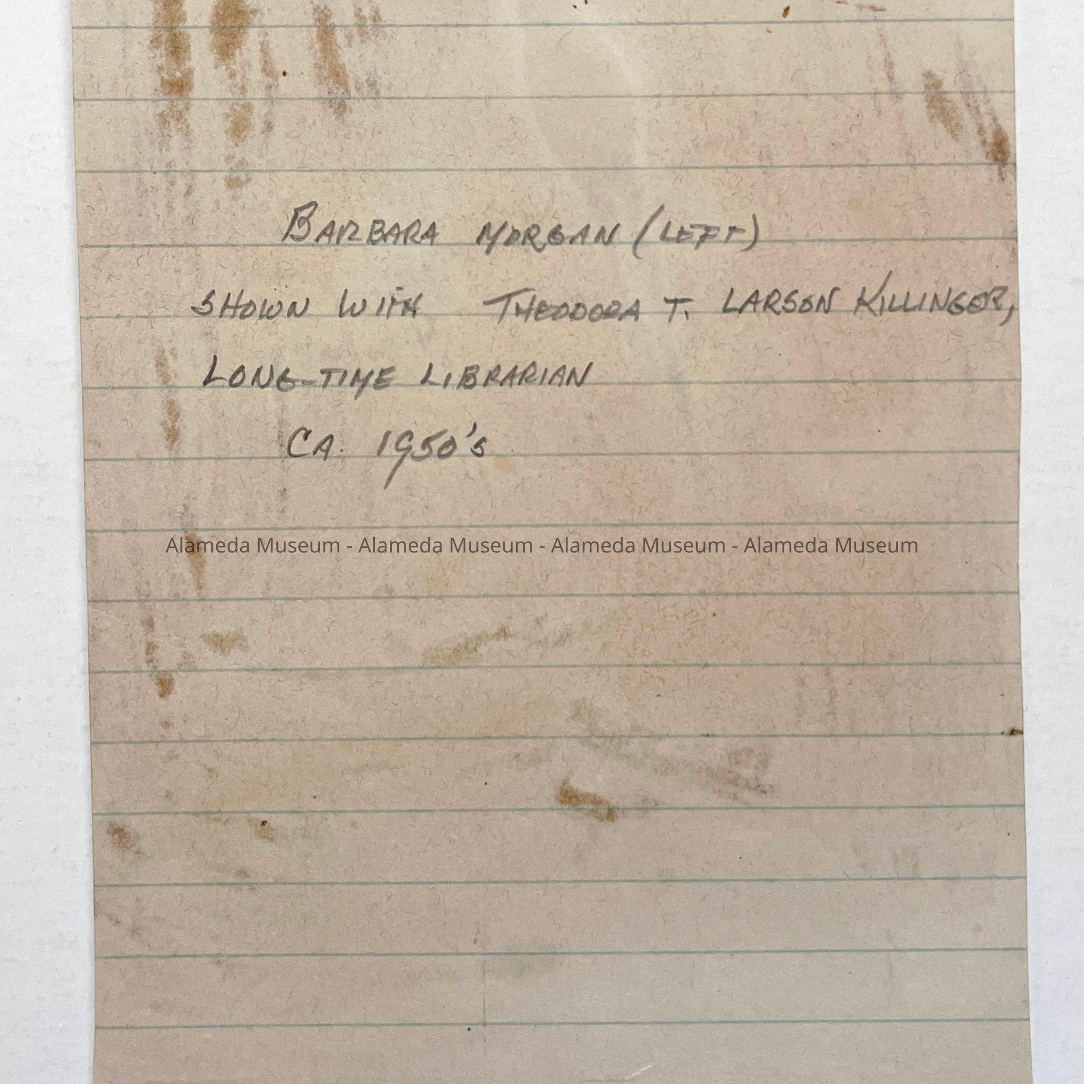 History of Object: Portrait of two local women: Barbara S. Morgan (at left) with Theodora T. (Larson) Killinger, a longtime City Librarian.