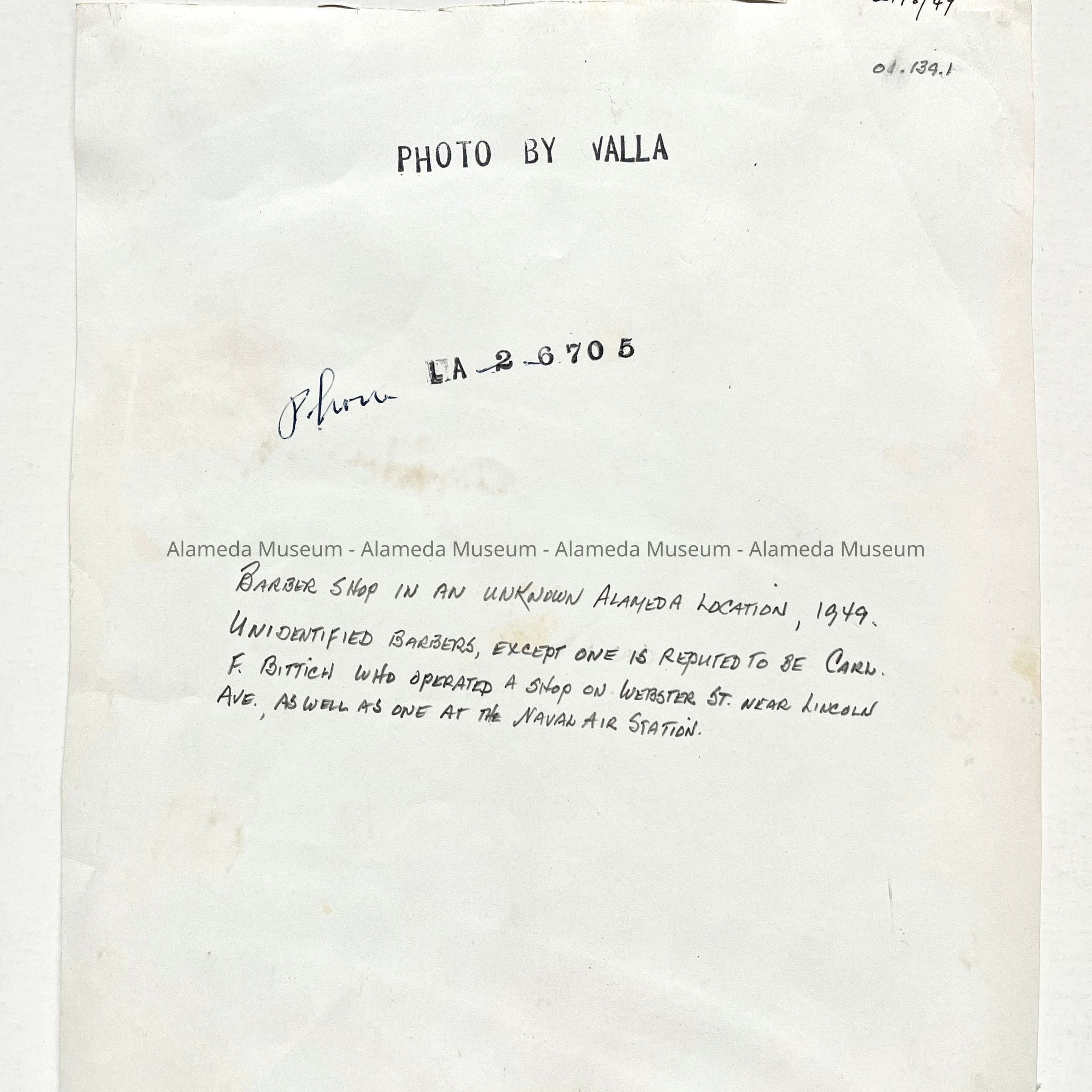 Photo of barber shop scene, by Valla, 1949Entry/Object ID