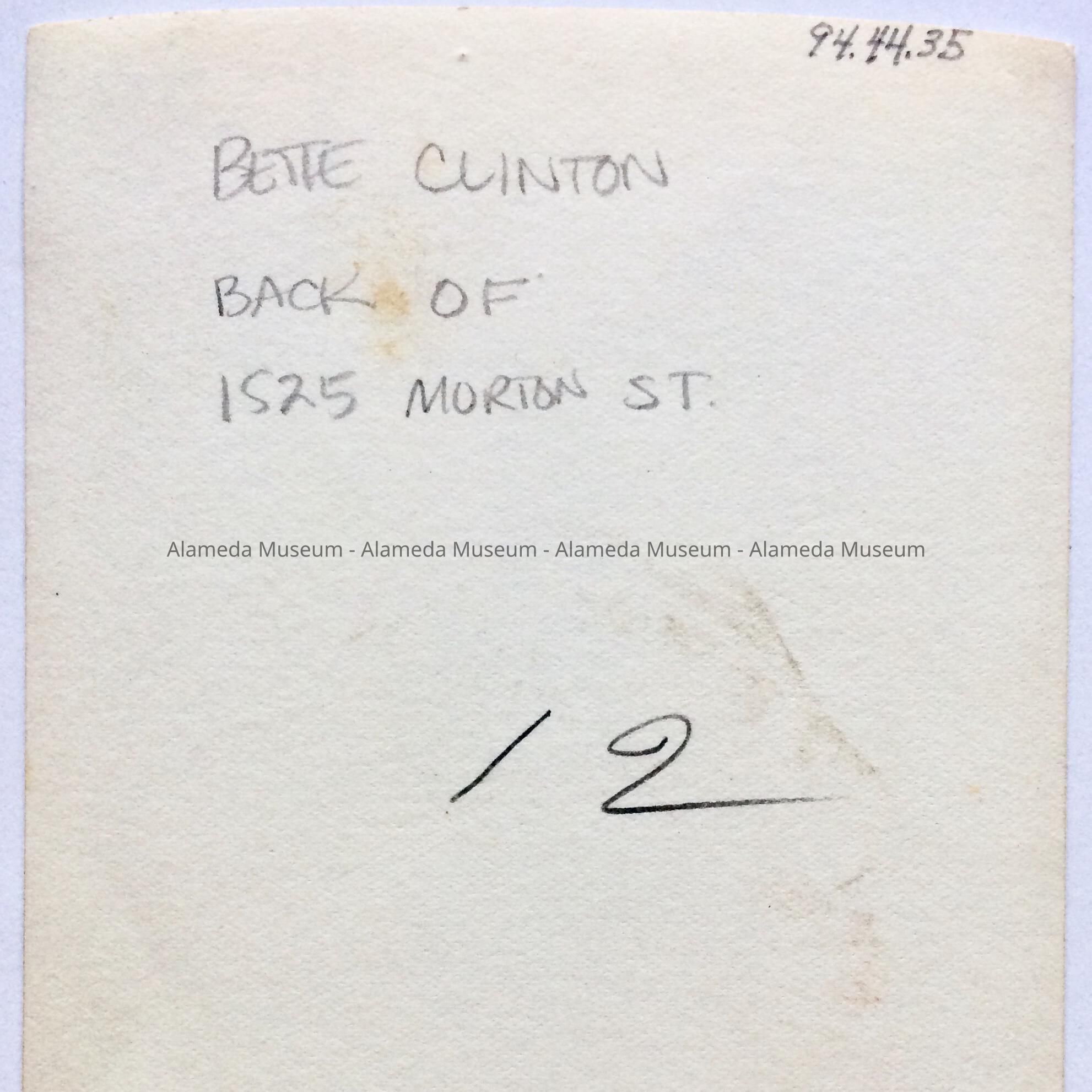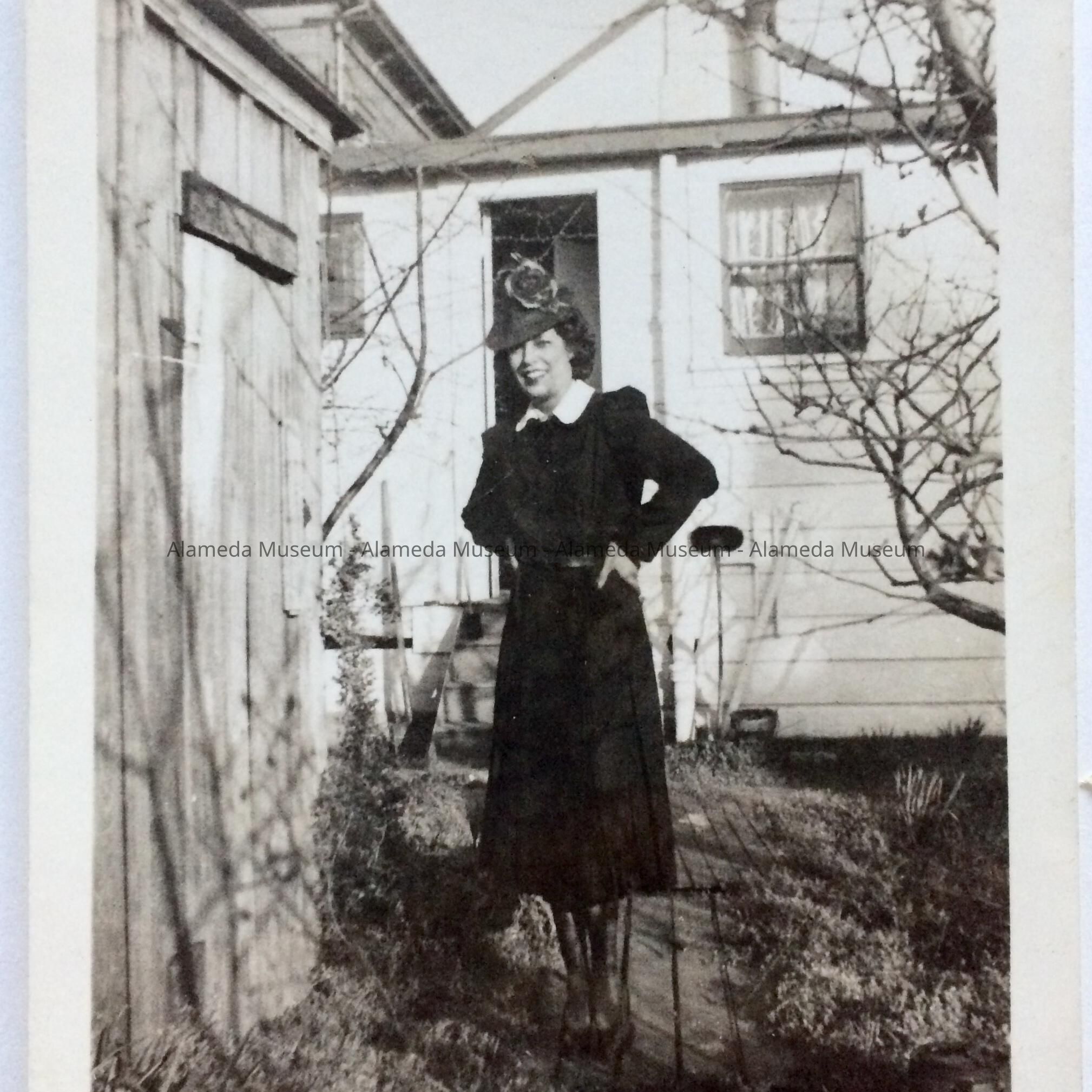 History of Object: Photograph of Bette Clinton in rear portion of 1525 Morton St. She was a member of an early African-American family of Alameda.