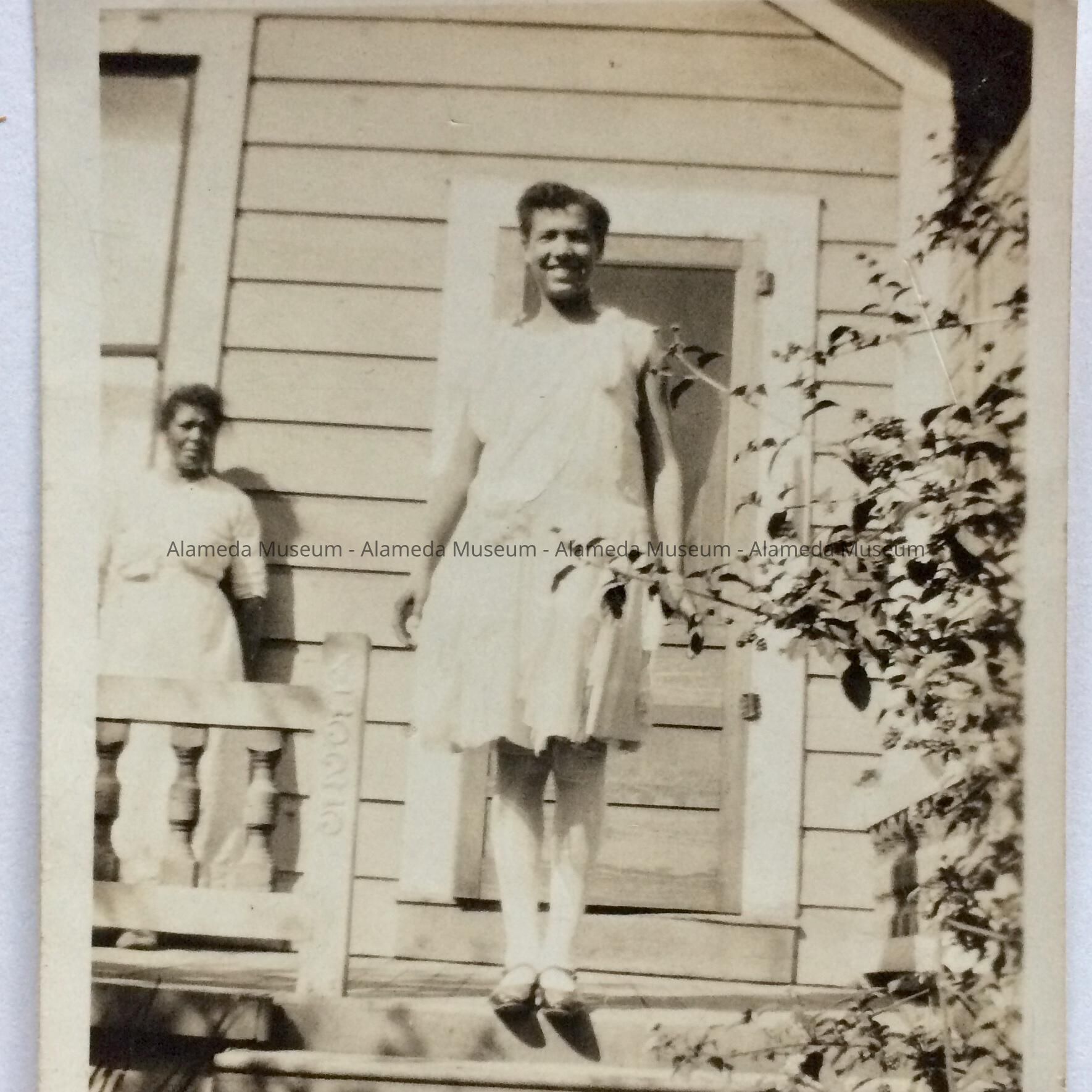 Photograph of Bette Clinton standing on the front porch of 1525 Morton St. The house was purchased in 1912 by the Clinton Family, early African-American residents of Alameda.