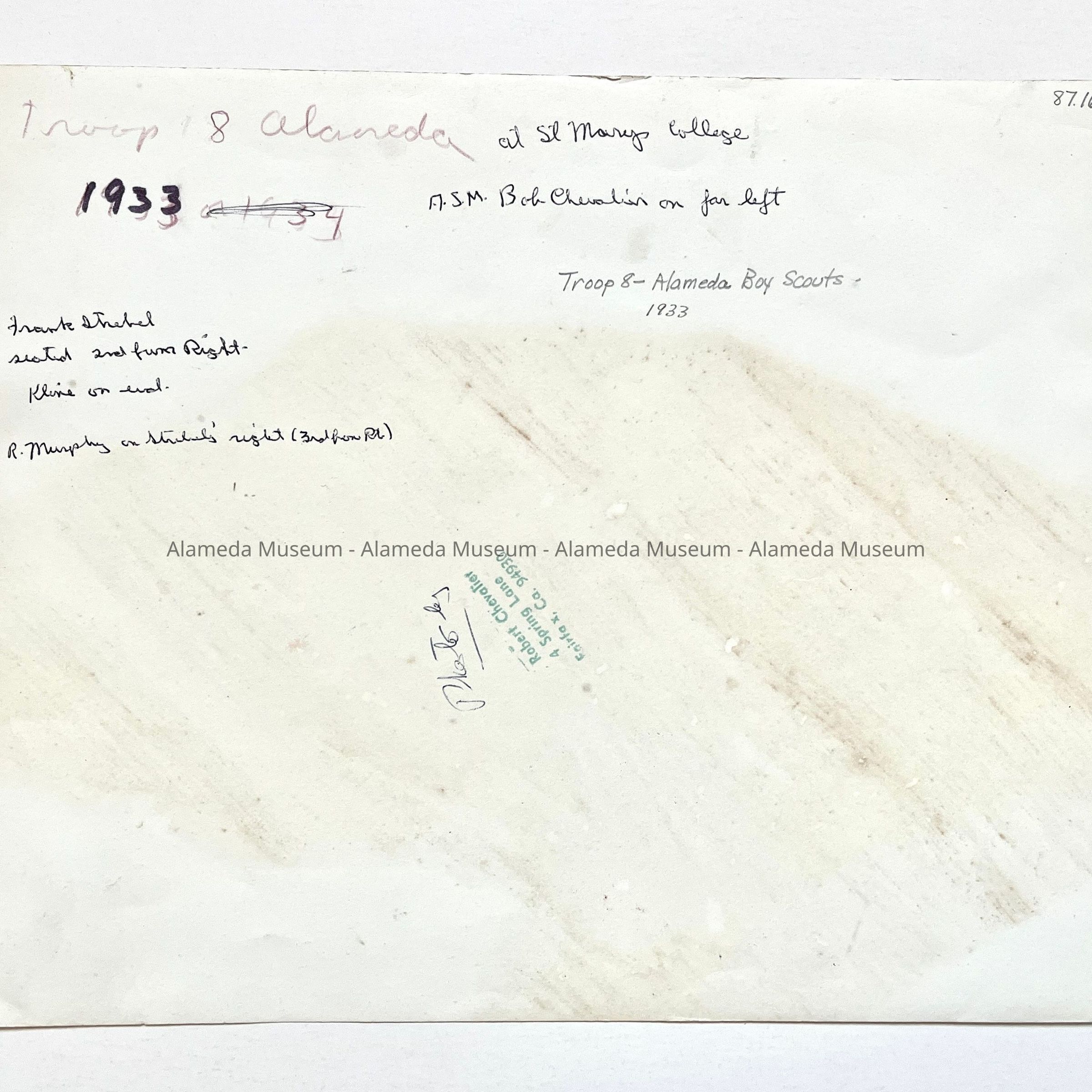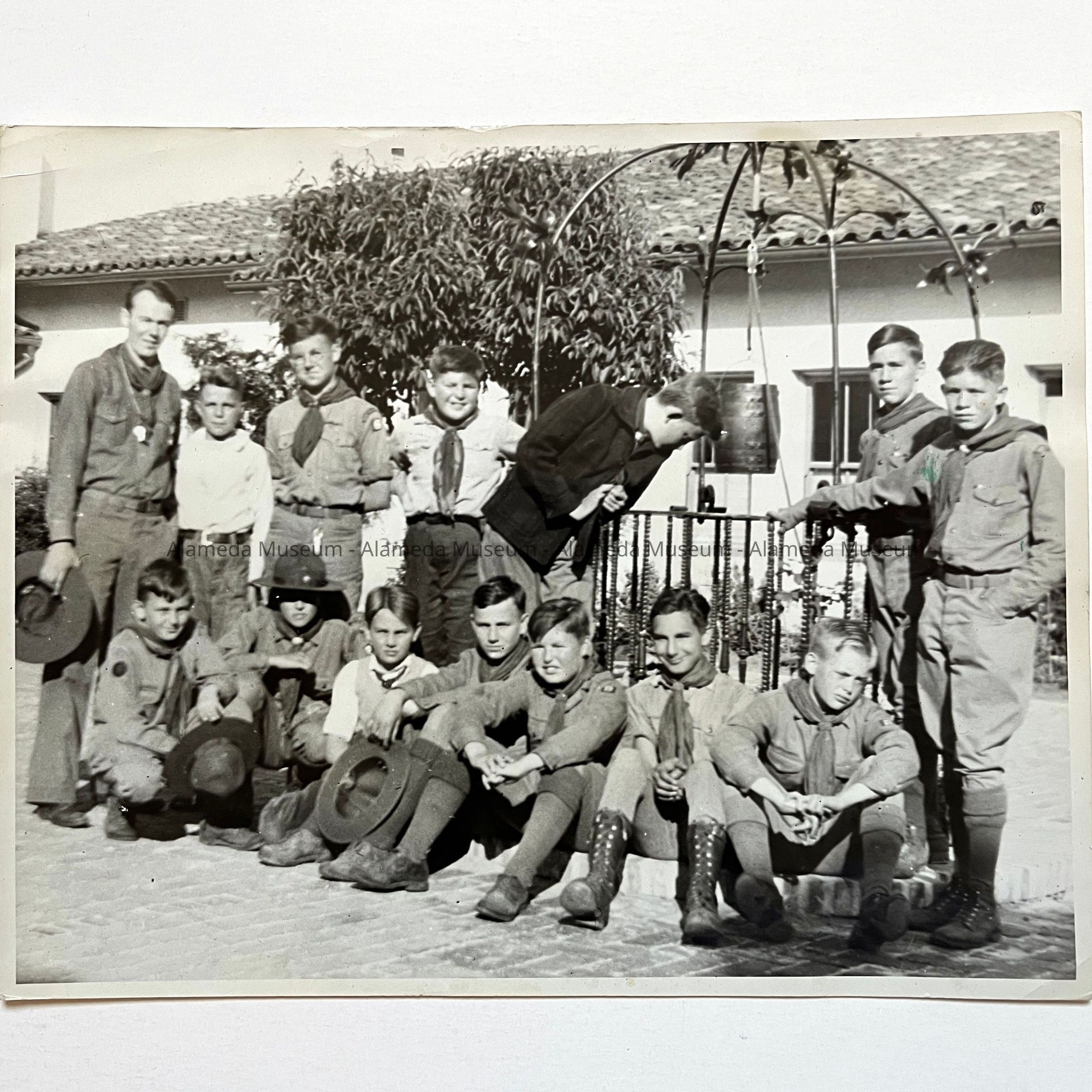Photograph (taken by the donor) of Troop 8., Alameda Boy Scouts on an outing to St. Mary's College. Mr. Chevalier is pictured on the far left (standing).