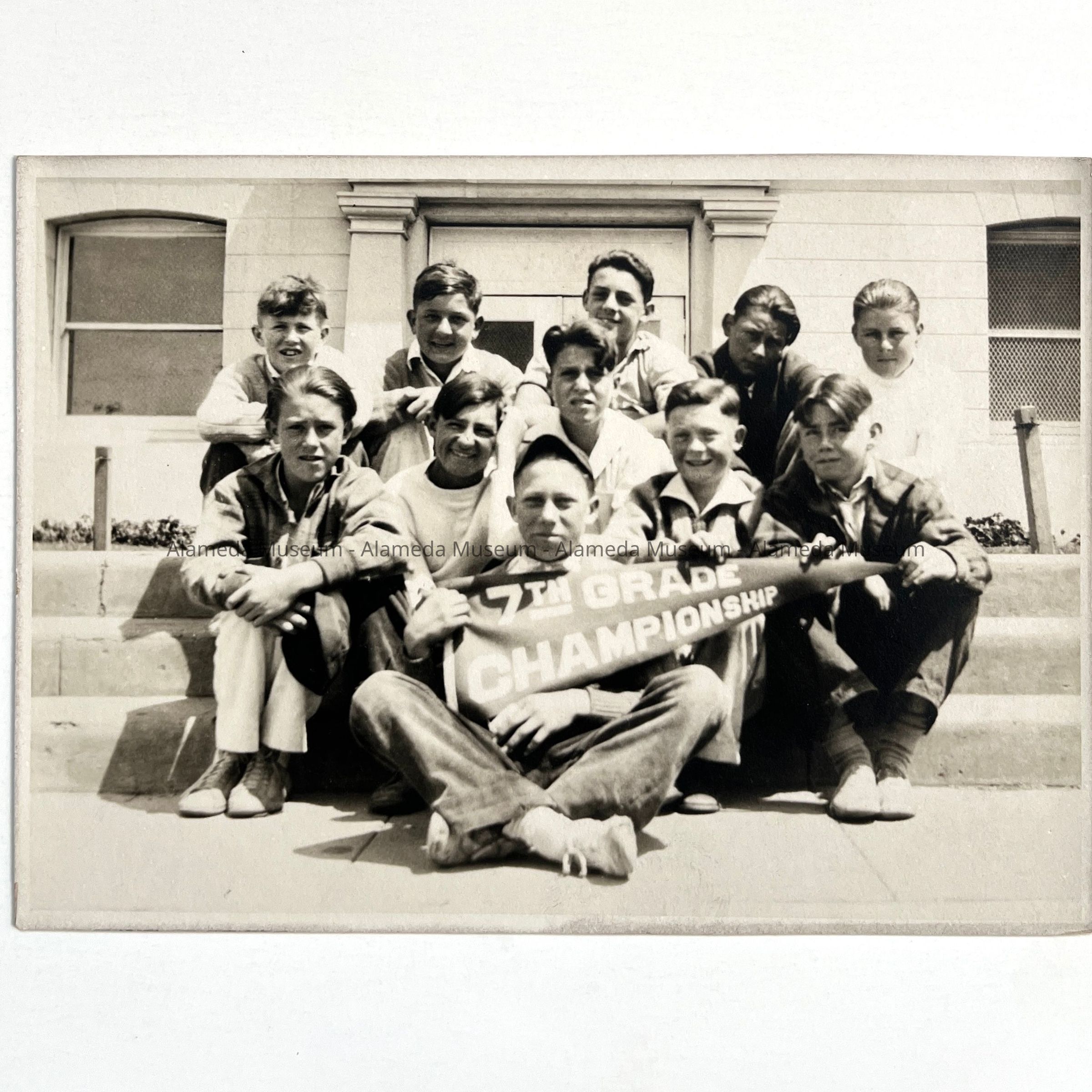 PHOTOGRAPH DEPICTING ELEVEN BOYS SITTING ON A SIDE STEP OF WASHINGTON SCHOOL, HOLDING A BANNER WHICH READS, "SEVENTH GRADE CHAMPIONSHIP." NO OTHER INFORMATION KNOWN.