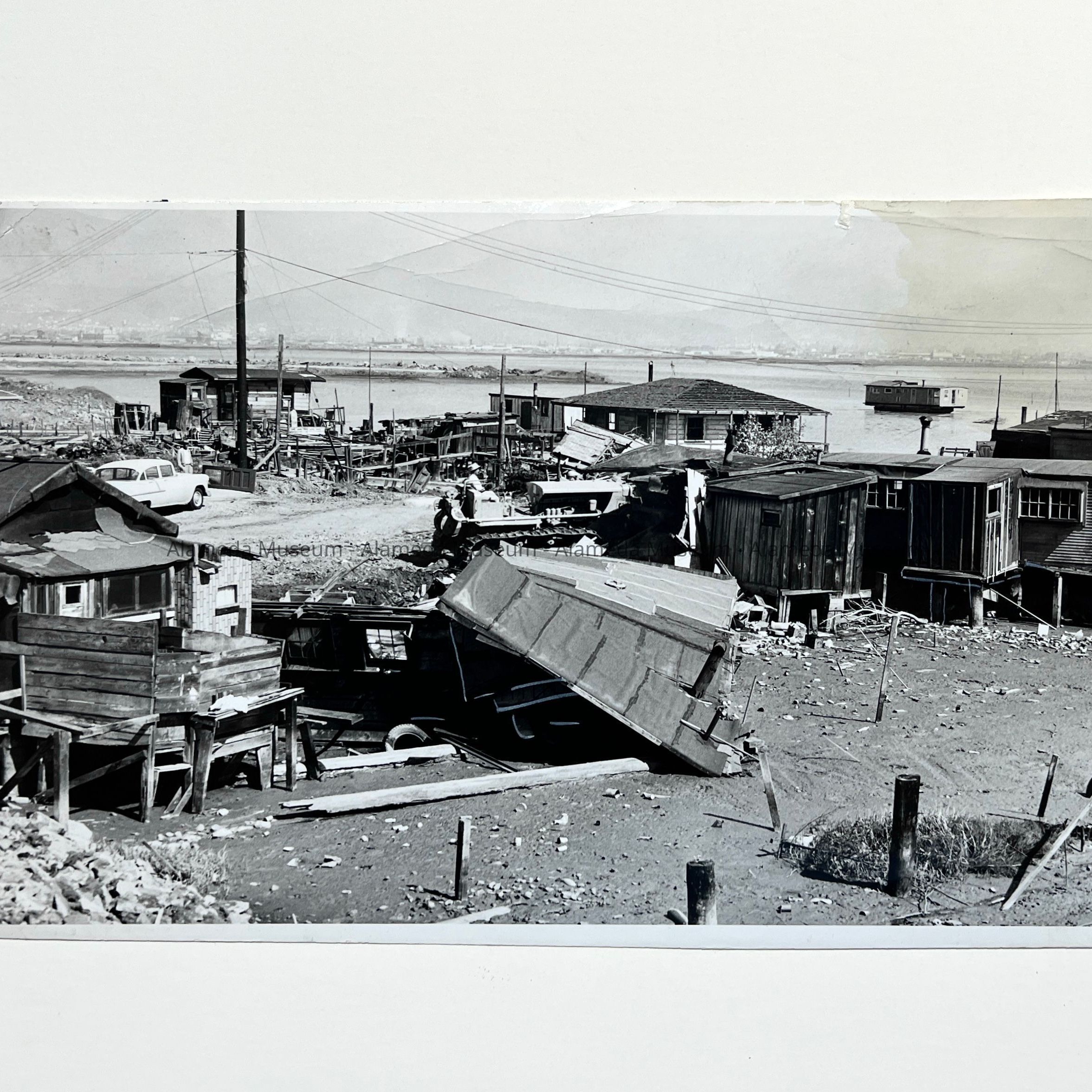 History of Object: Scene showing the bulldozing of the duck hunters' cabins preparatory to the construction of the new Bay Farm Island Bridge.