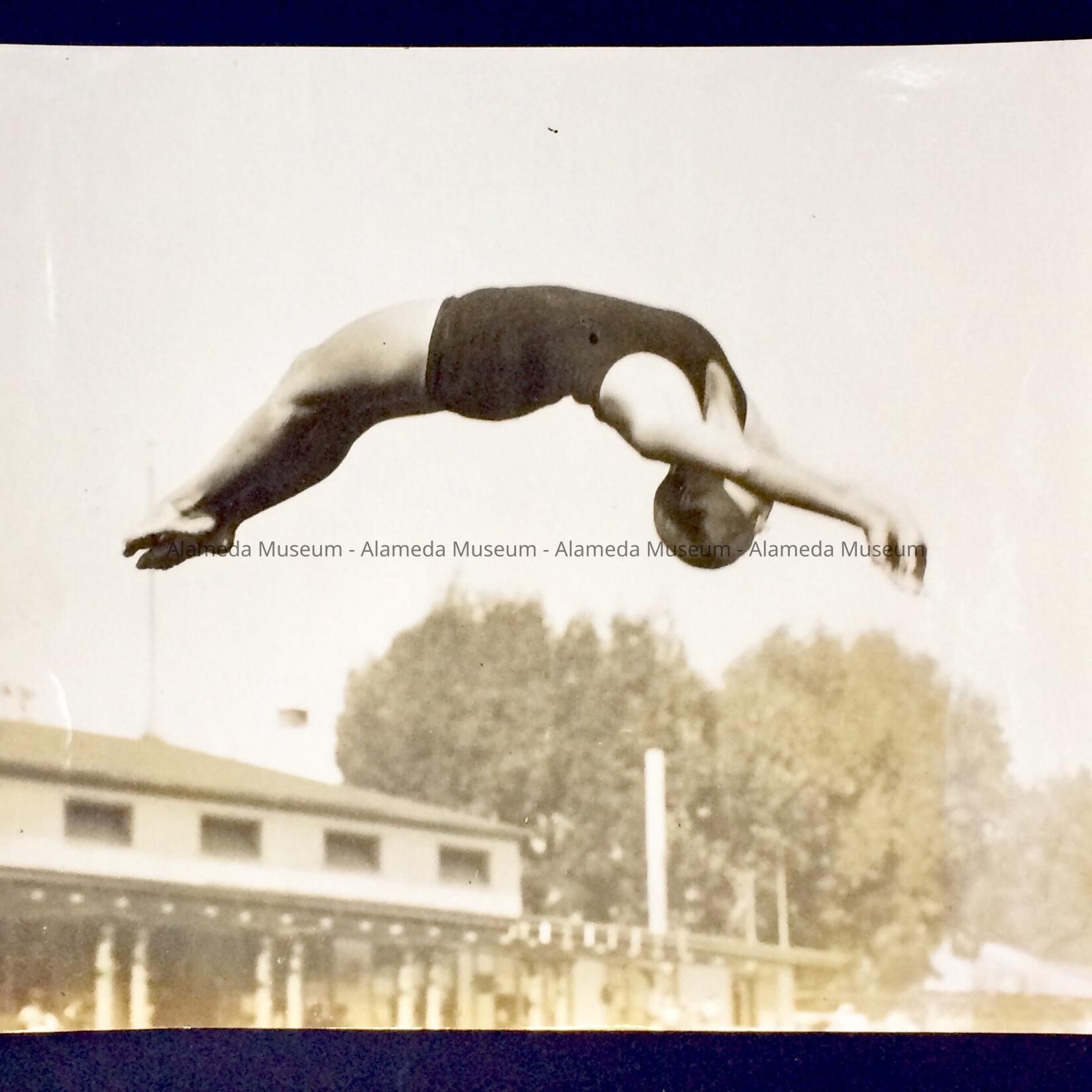 A PHOTO OF BUNNY FERGUS PERFORMING A BACKFLIP FROM A DIVING BOARD AT NEPTUNE BEACH, ALAMEDA.