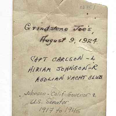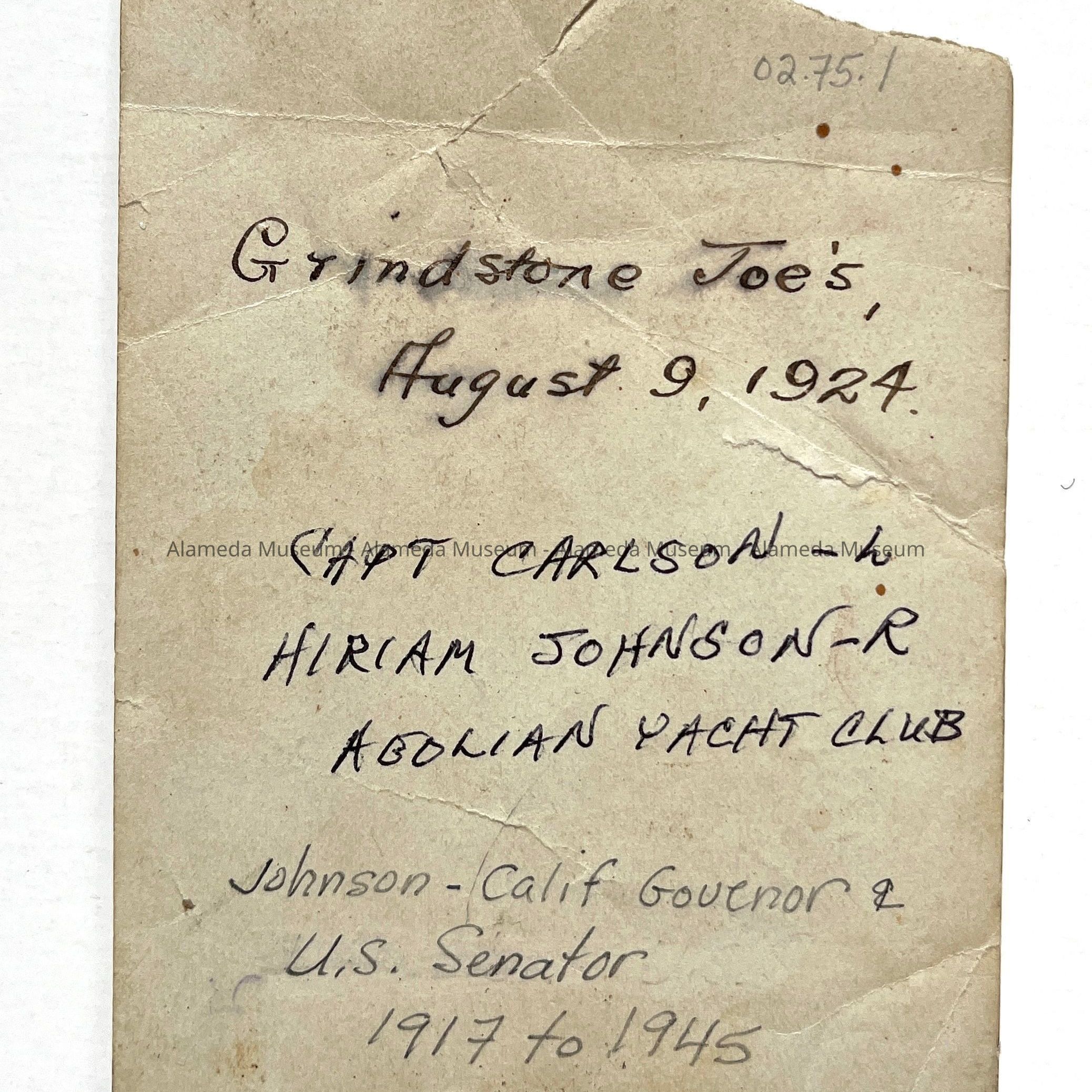 Photo of Captain Carlson and Hiriam Johnson, Aeolian Yacht Club, 1924Entry/Object ID