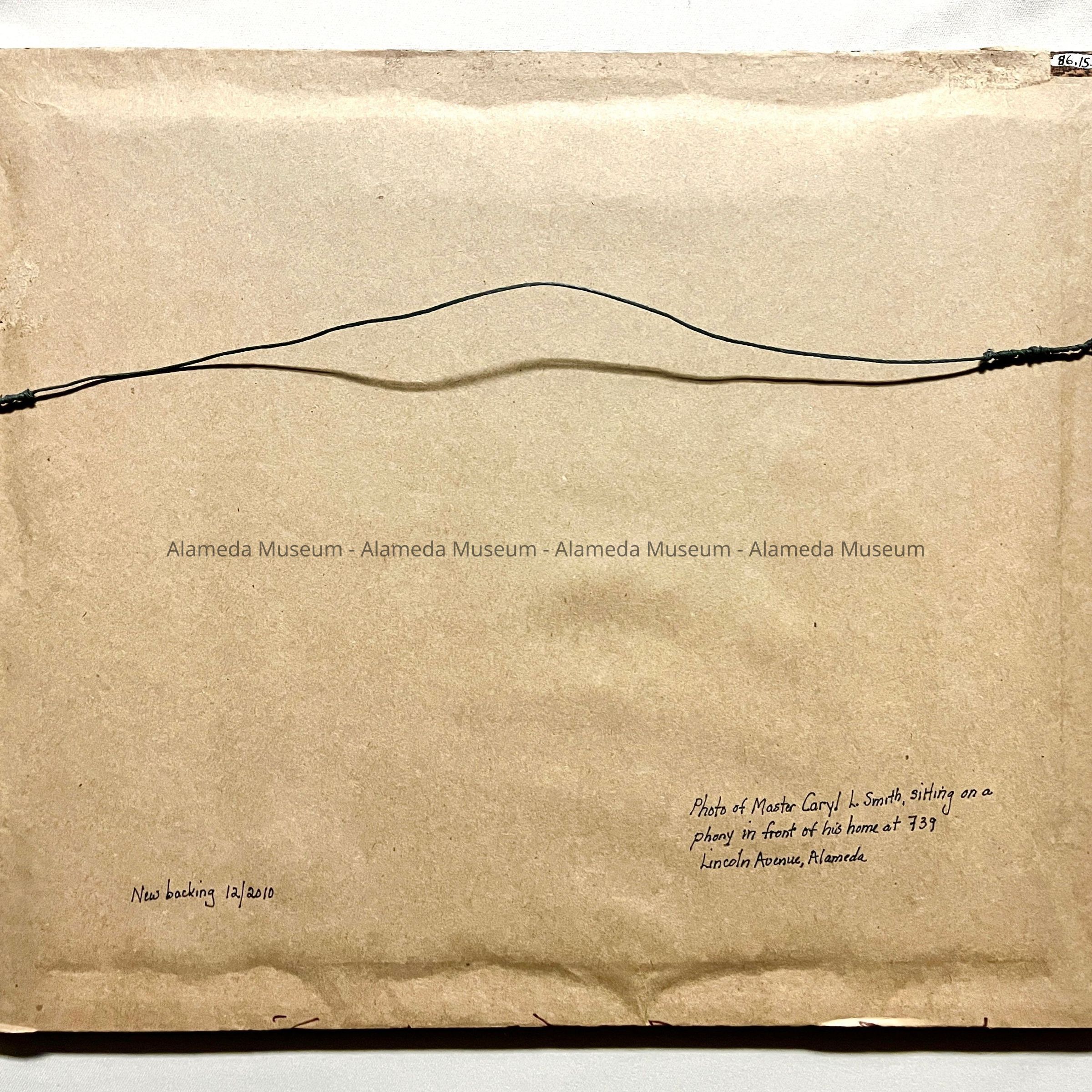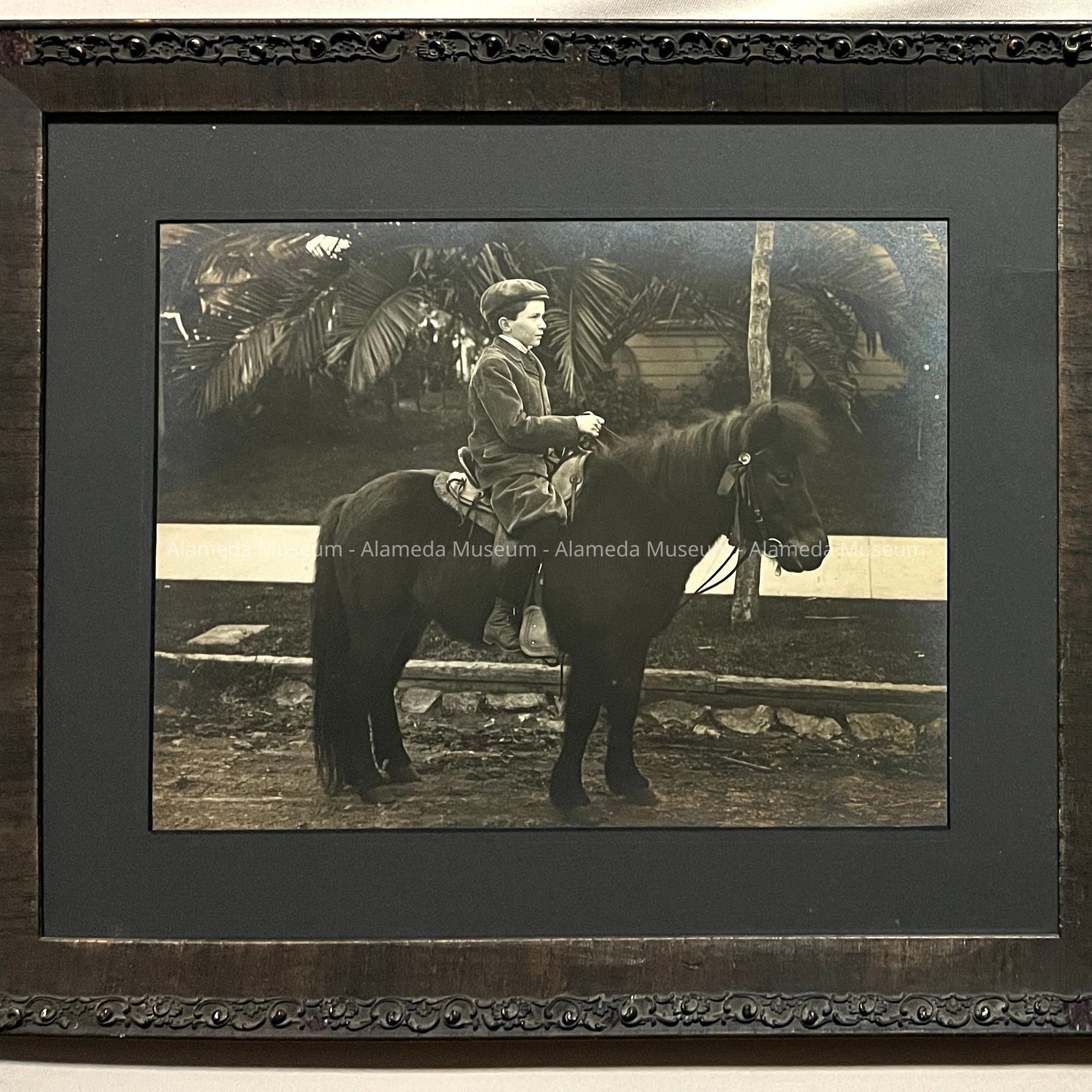 History of Object: Framed photo of Master Caryl L. Smith (as a child), sitting on a phony in front of his home at 739 Lincoln Avenue, Alameda.
