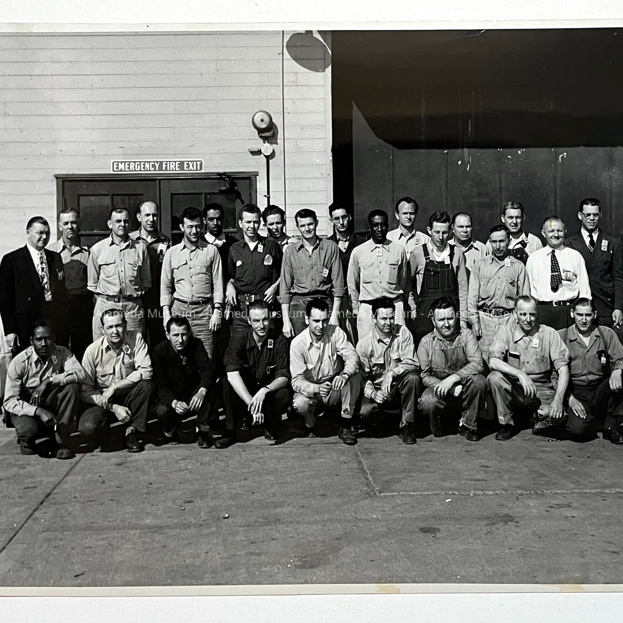 PHOTOGRAPH OF CASTOR NIELSEN, APPRENTICE, AT NAVAL AIR STATION, ALAMEDA. MR NIELSEN IS WEARING A DARK SUIT AND IS PICTURED AT THE LEFT OF THE PHOTO.