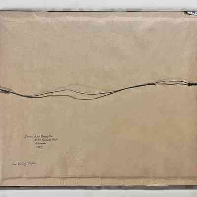 BLACK-AND-WHITE PHOTOGRAPH, WITH GRAY-COLORED MOUNTING IN A WOODEN FRAME WITH A WALNUT-COLORED STAIN. PHOTO HAS A HANDWRITTEN CAPTION, "ALAMEDA BOATING CLUB."