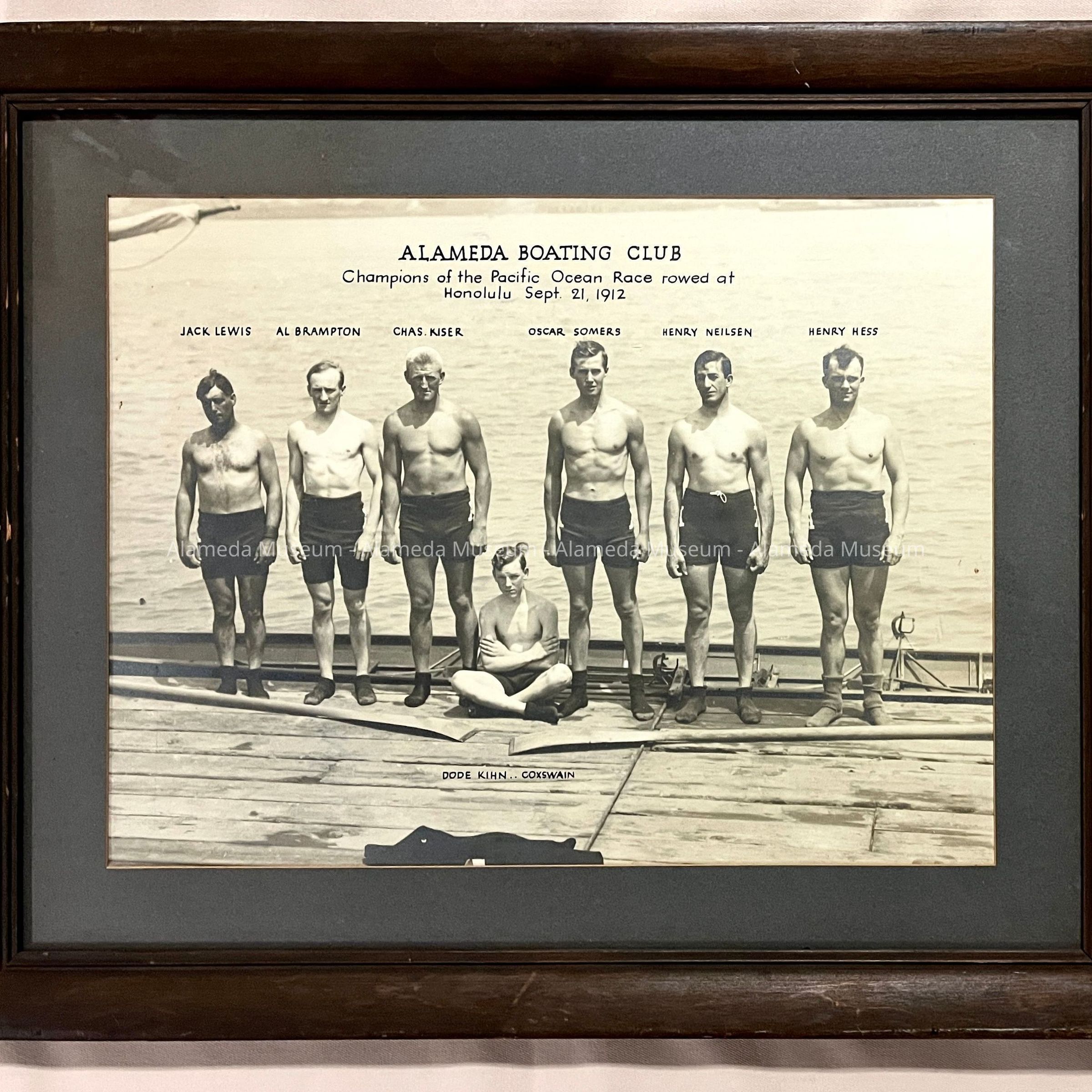 A PHOTOGRAPH OF SEVEN (7) CHAMPION MEMBERS OF THE ALAMEDA BOATING CLUB. THEY WERE CHAMPIONS OF THE PACIFIC OCEAN RACE IN HONOLULU ON SEPTEMBER 21, 1912.