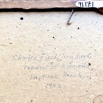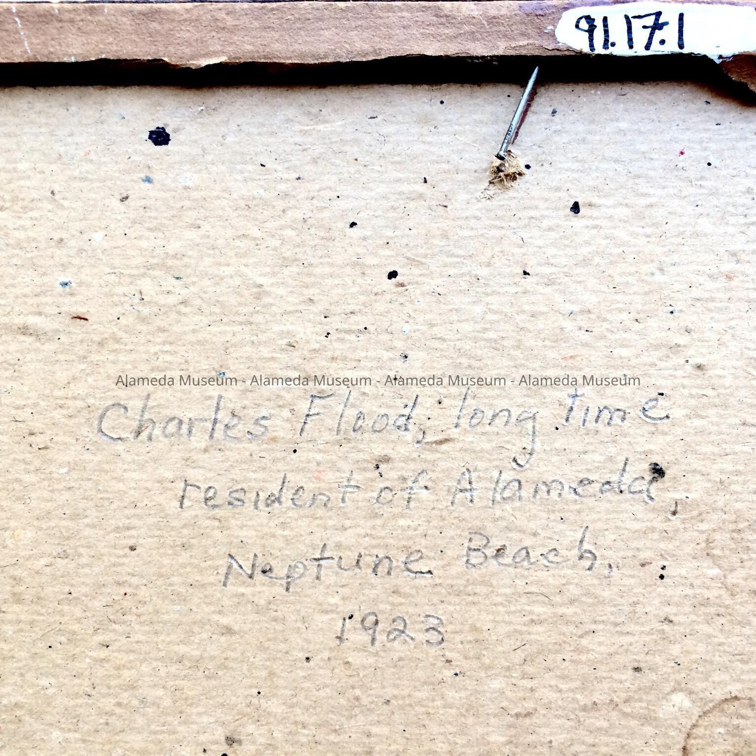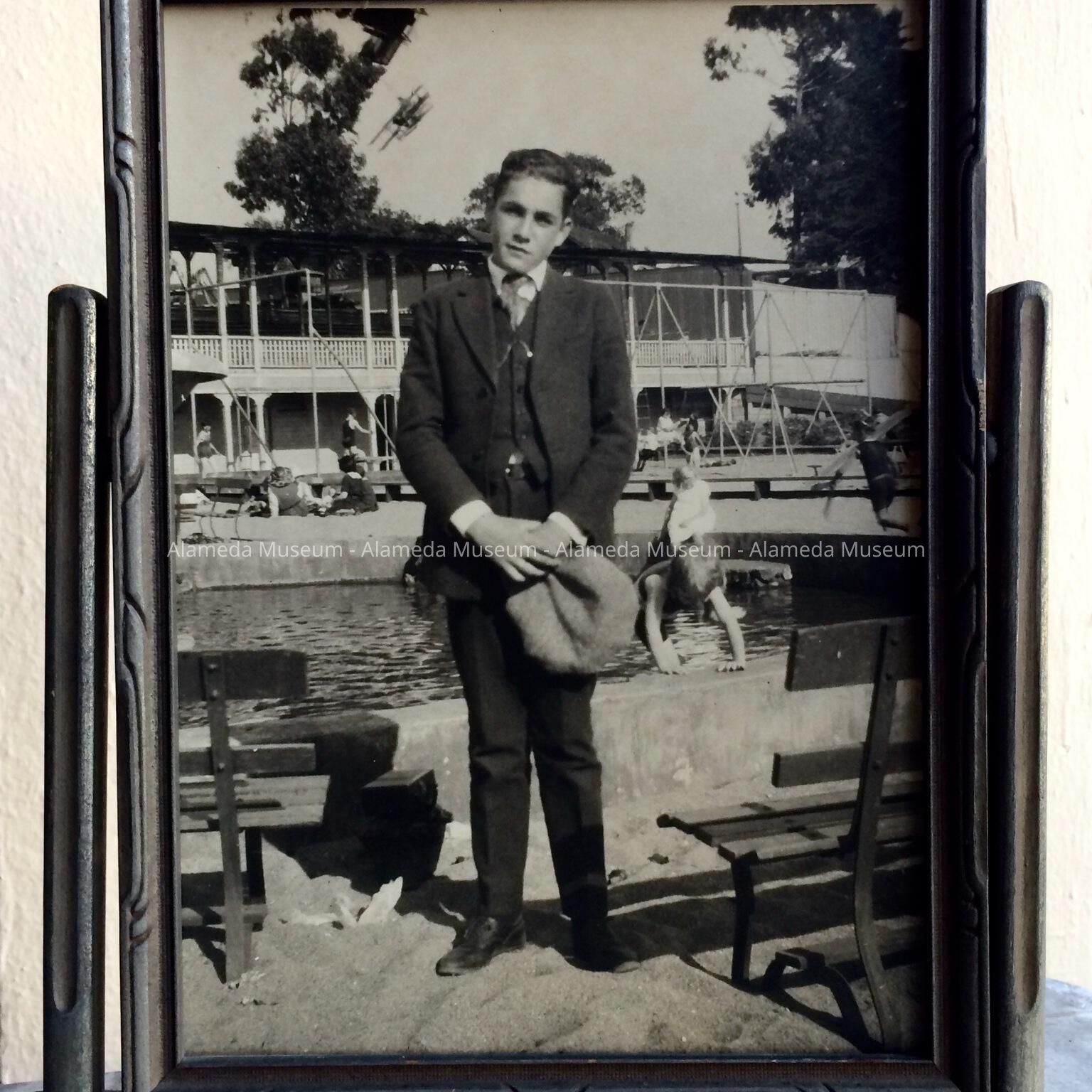 History of Object: Photo of Charles E. Flood, born San Francisco Feb. 2, 1909, brought to Alameda at the age of two. Lived his entire life in the family home at 2941 Lincoln Avenue. Mr. Flood was employed for many years as a freight agent, Traffic Dept., Southern Pacific Co., S.F. The photo, taken in 1923, depicts Mr. Flood, as a young man, standing by the children's wading pool, Neptune