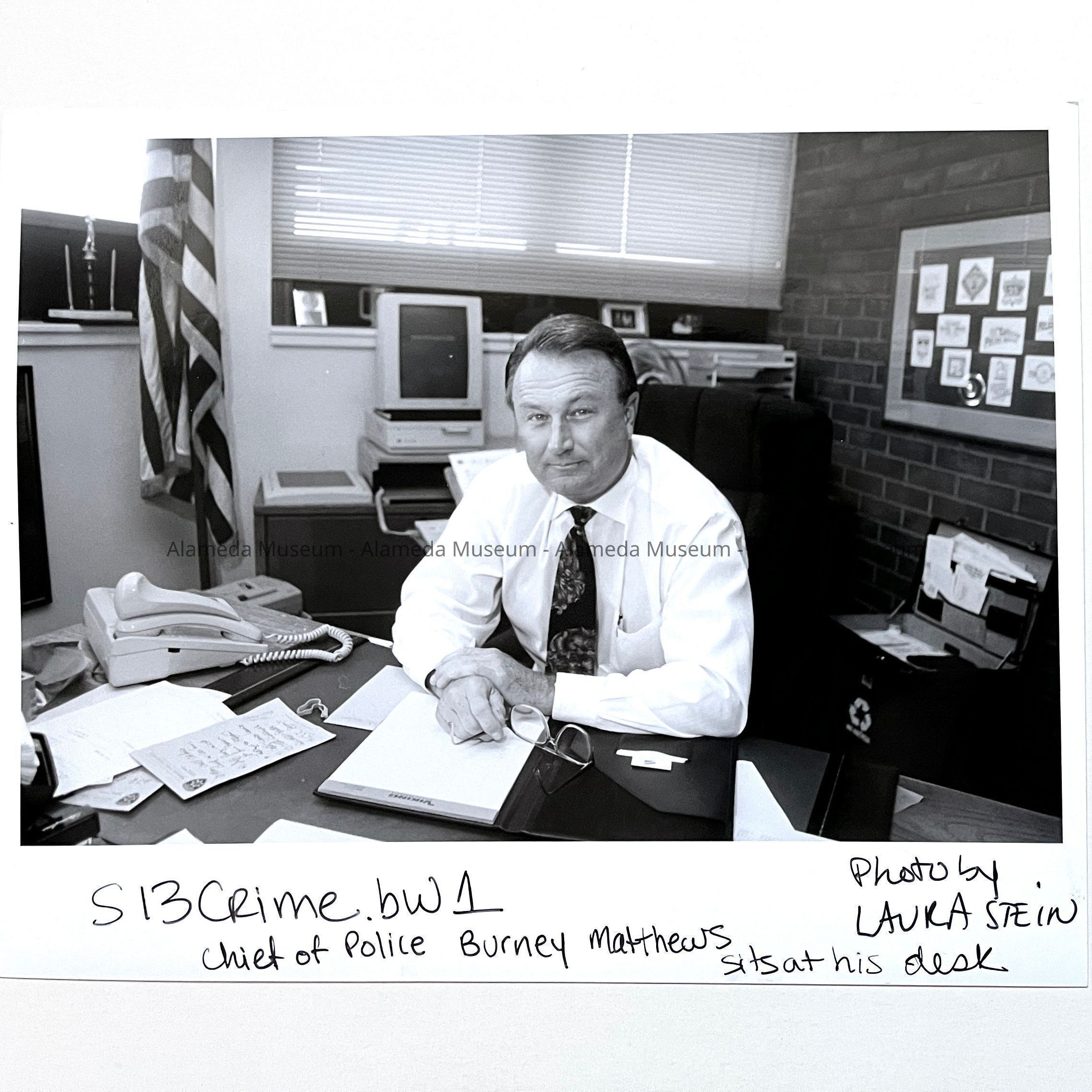 Photo of Chief of Police Burnham Matthews at his desk, c. 1990sEntry/Object ID