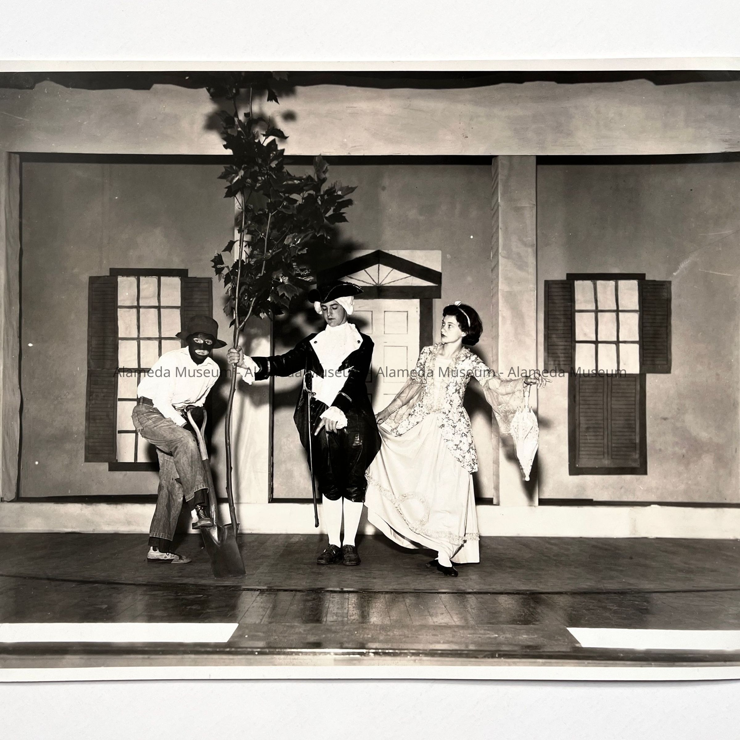 Photo of three unidentified children in Colonial costumes (George & Martha Washington) in a play at Haight School, Alameda.