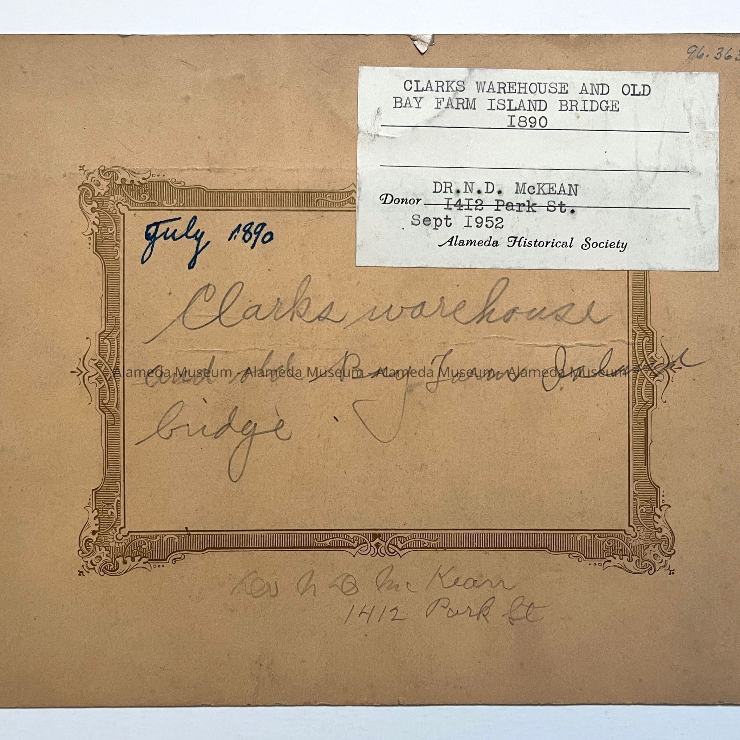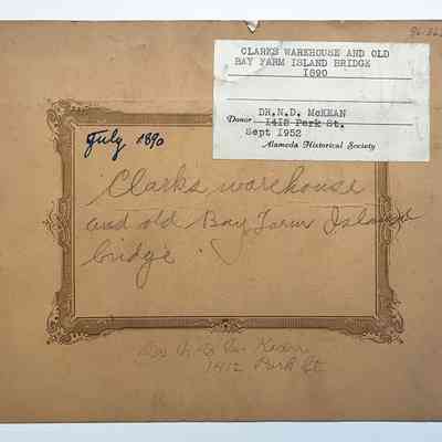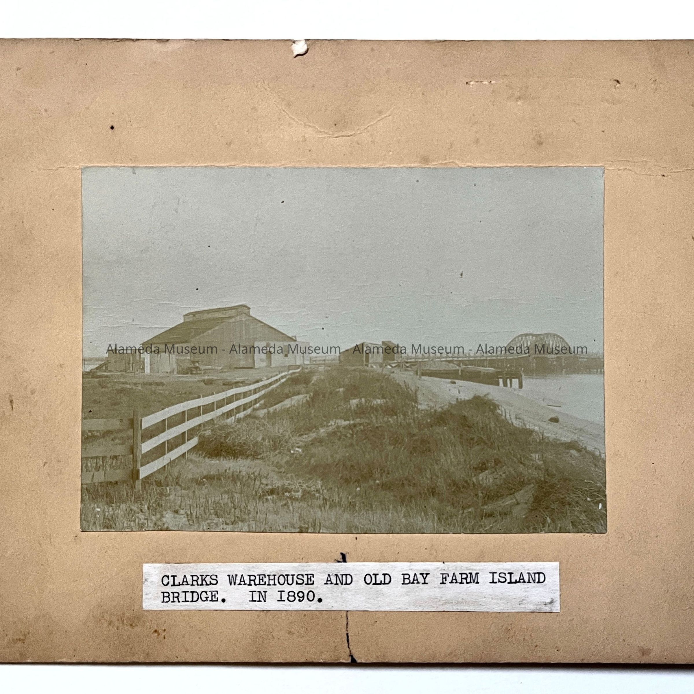 Photo of Clarks Warehouse, with the old Bay Farm Island Bridge, 1890Entry/Object ID