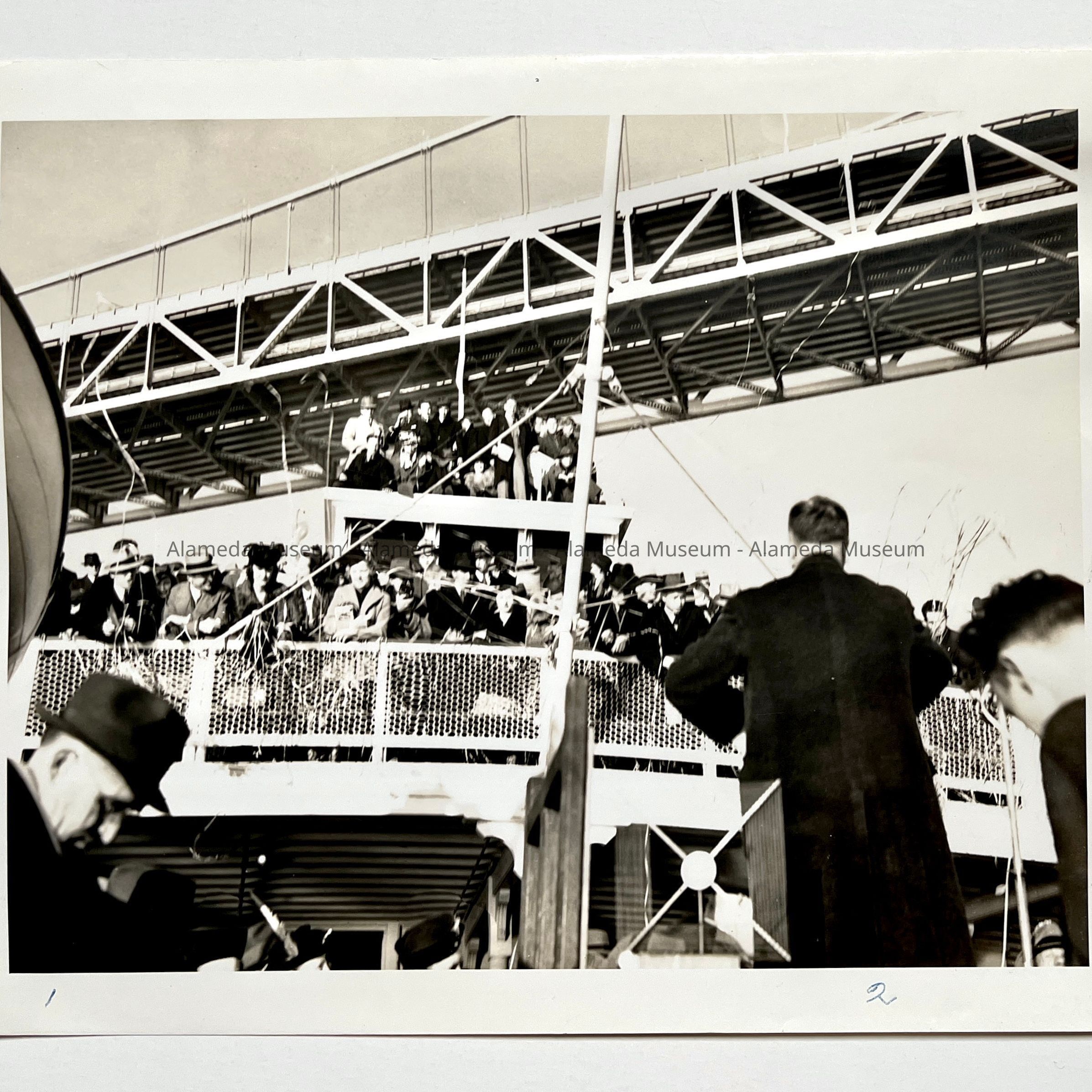 Photo of commuters on a ferry underneath the Bay Bridge, 1938Entry/Object ID