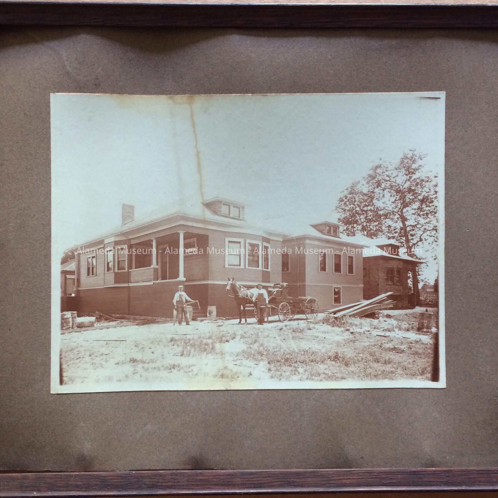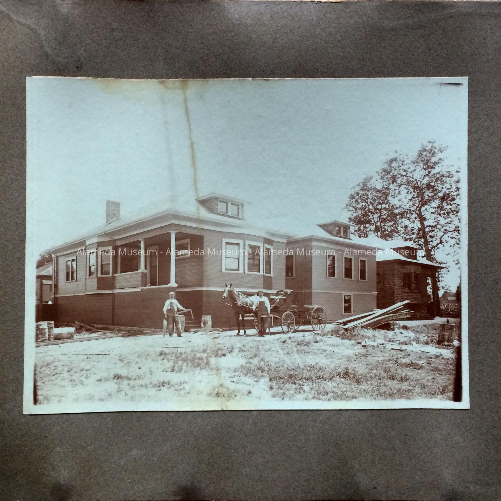 Photo of Conrad Roth (center) standing with a horse & buggy at a building site (exact location unknown), Alameda, California. In the photo three high basement cottages (Colonial Revival style) are just being completed.