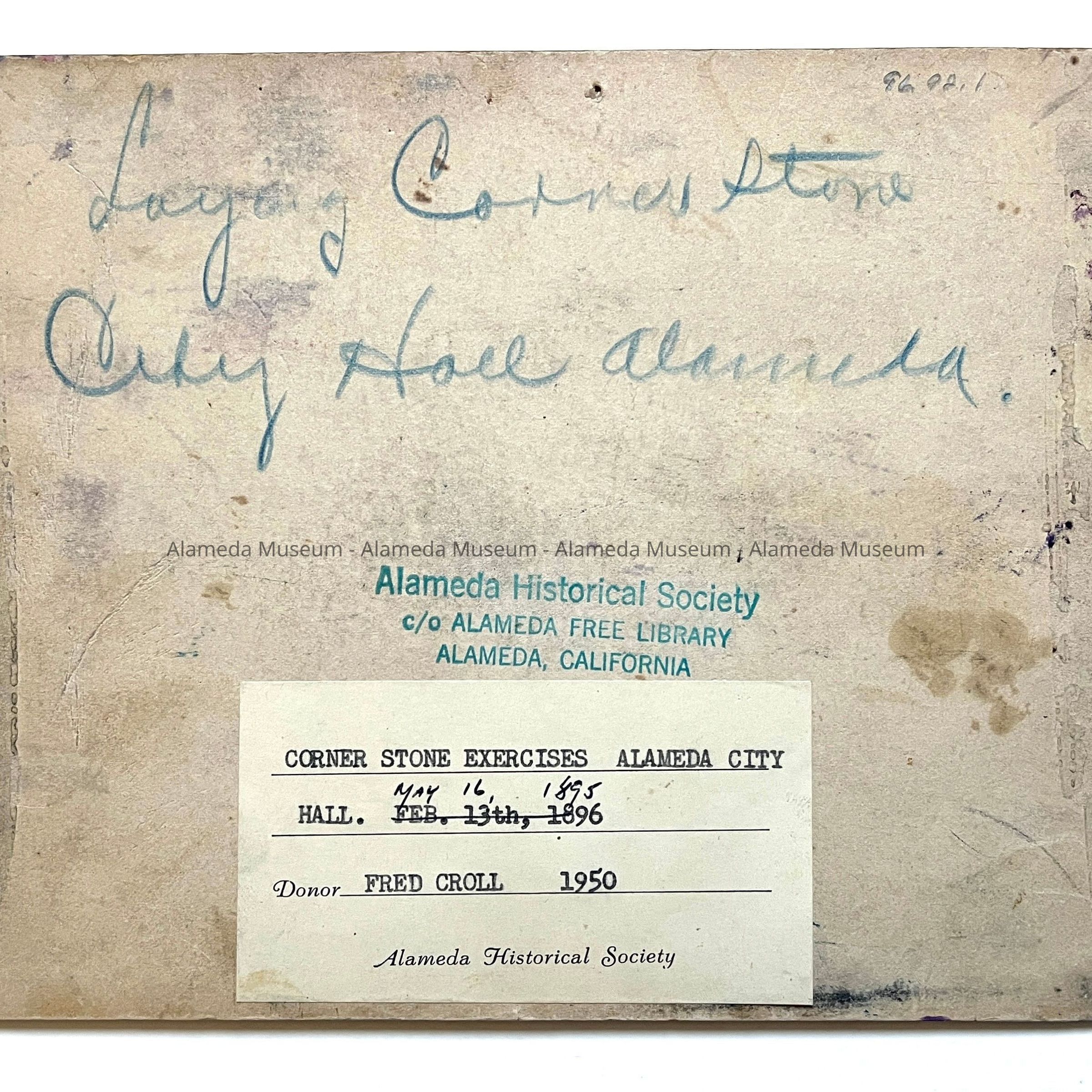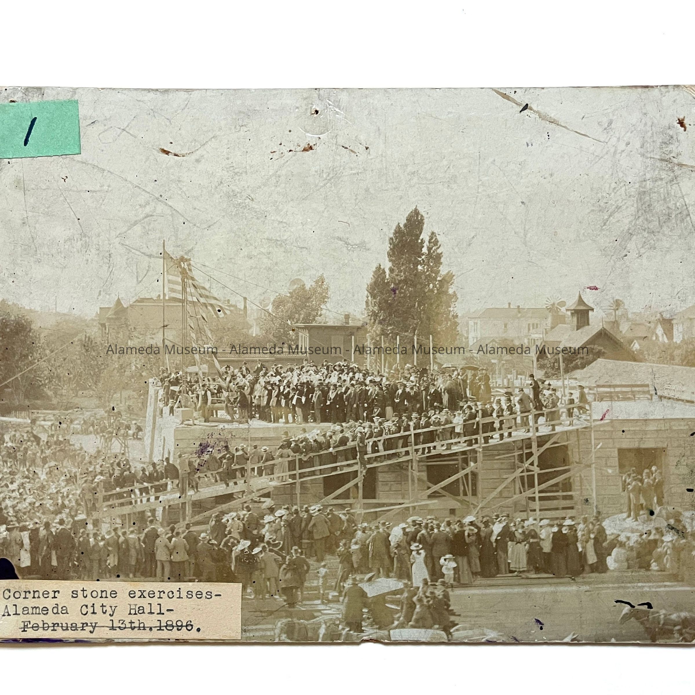 History of Object: View of the cornerstone laying ceremonies by the Alameda Masonic Lodge of the new City Hall, May 16, 1895 (same image as Acc. No. 96.93.1).