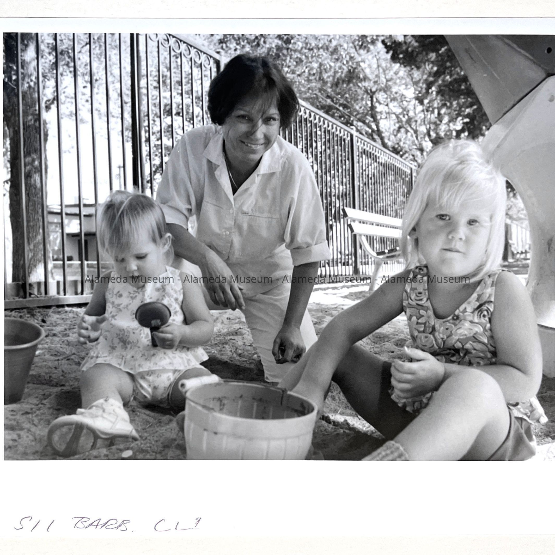 History of Object: Councilmember Barbara Thomas (1987–1991) posing with toddlers playing in a sandbox.