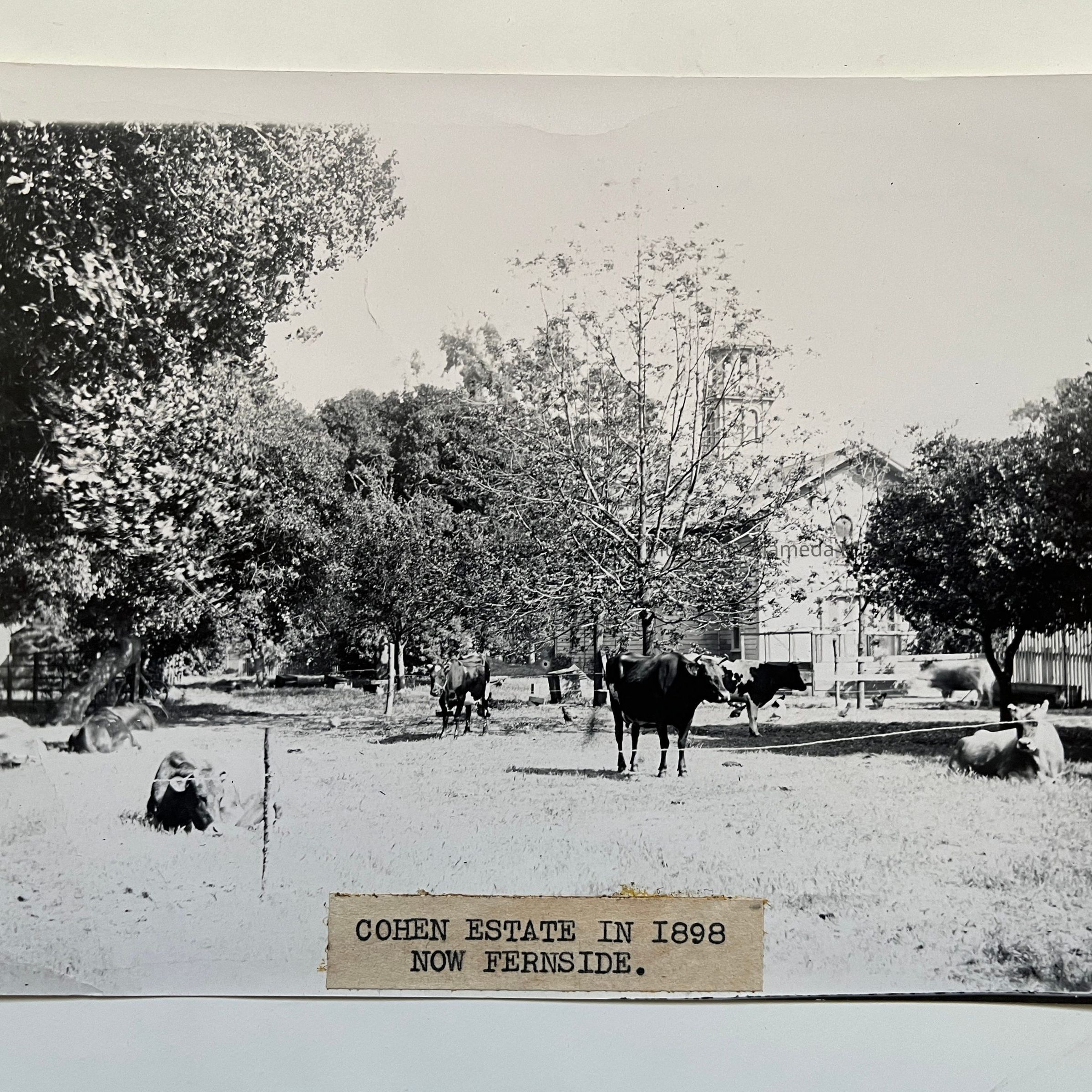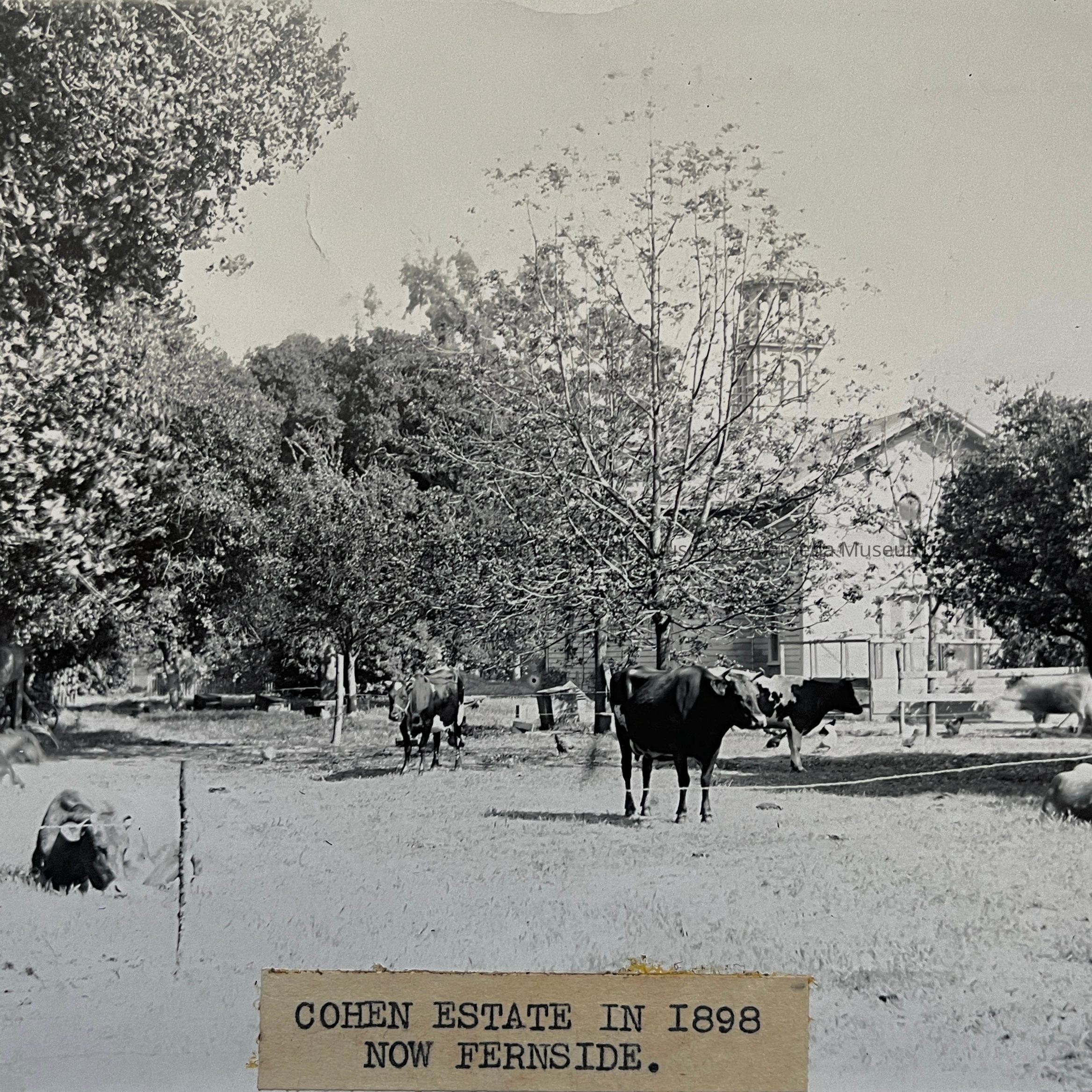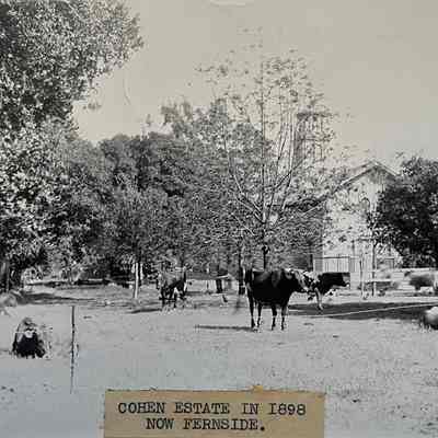 History: Photo depicting herd of cows and carriage house of the A.A. Cohen estate known as Fernside. The photo was made from a glass negative and attributed to Edgar A. Cohen, a prolific photographer. Edgar was the son of A.A. and Emilee Cohen. Mr. Cohen later moved to the Carmel area.