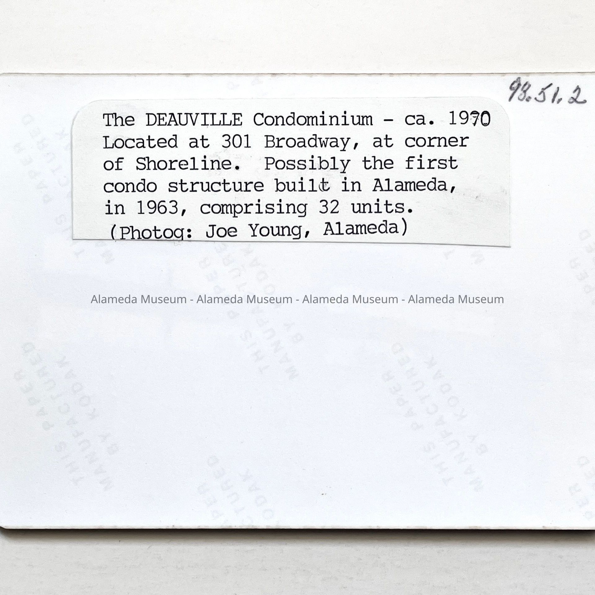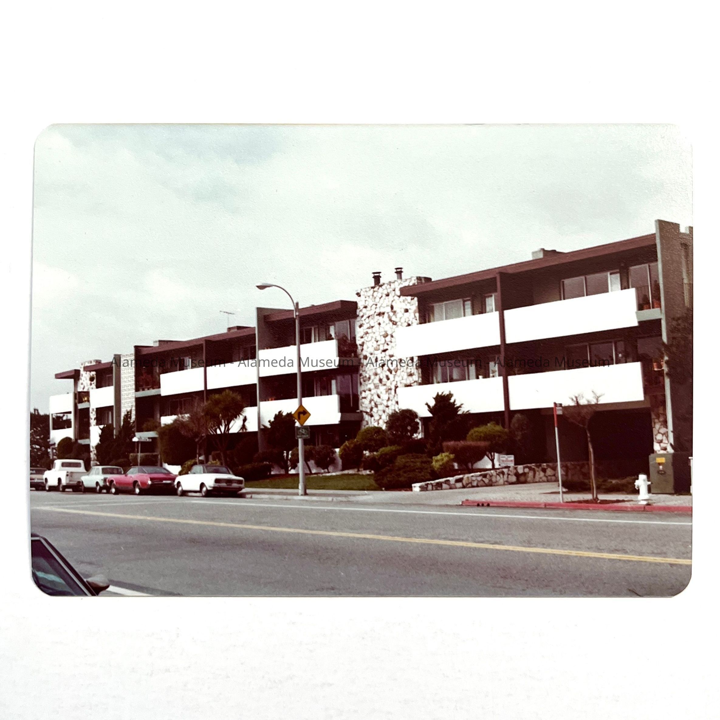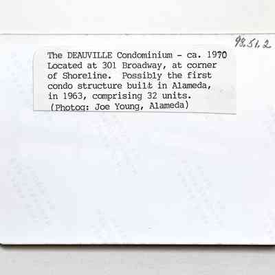 History of Object: The Deauville Condominium building located at the corner of Broadway and Shoreline Drive. It was constructed in 1963 and is possibly the first condominium ownership structure built in Alameda. It comprised 32 units.