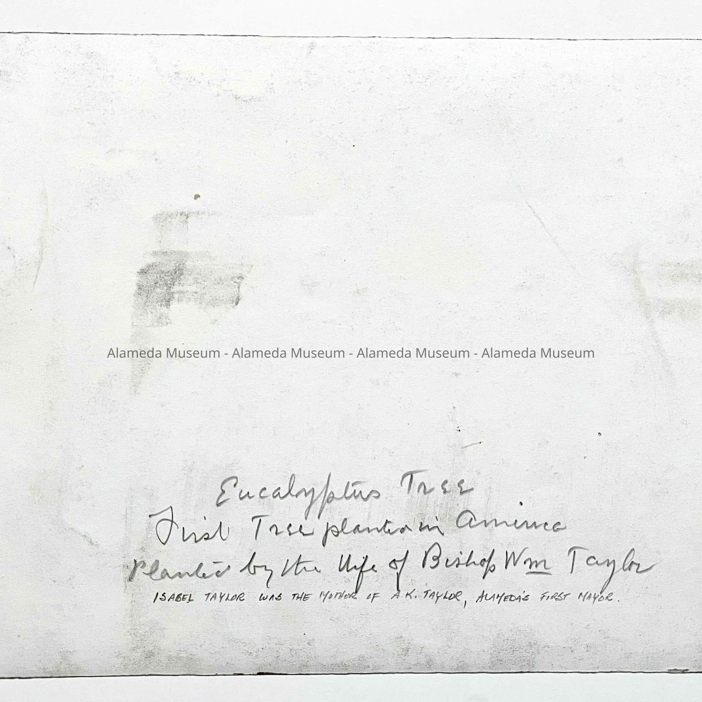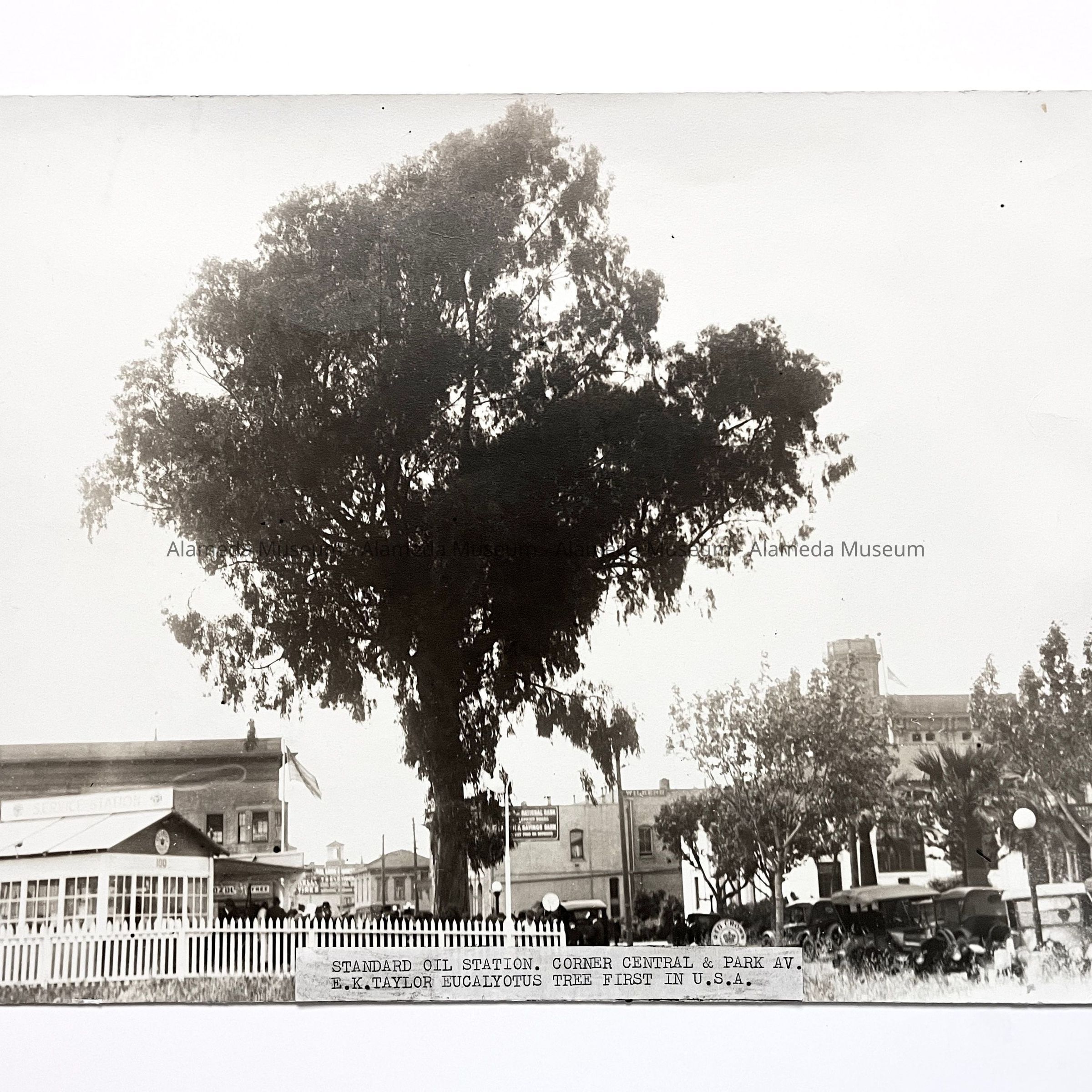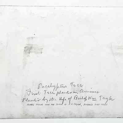 History of object: An apparent dedication ceremony being held at the base of the eucalyptus tree located at the corner of central and Park Avenues. This tree had been planted many years before by Isabel Taylor, wife of Methodist Bishop William Taylor, and who were the parents of A.K. Taylor, Alameda's first mayor. This tree is said to have been the first of its species brought to the U.S.