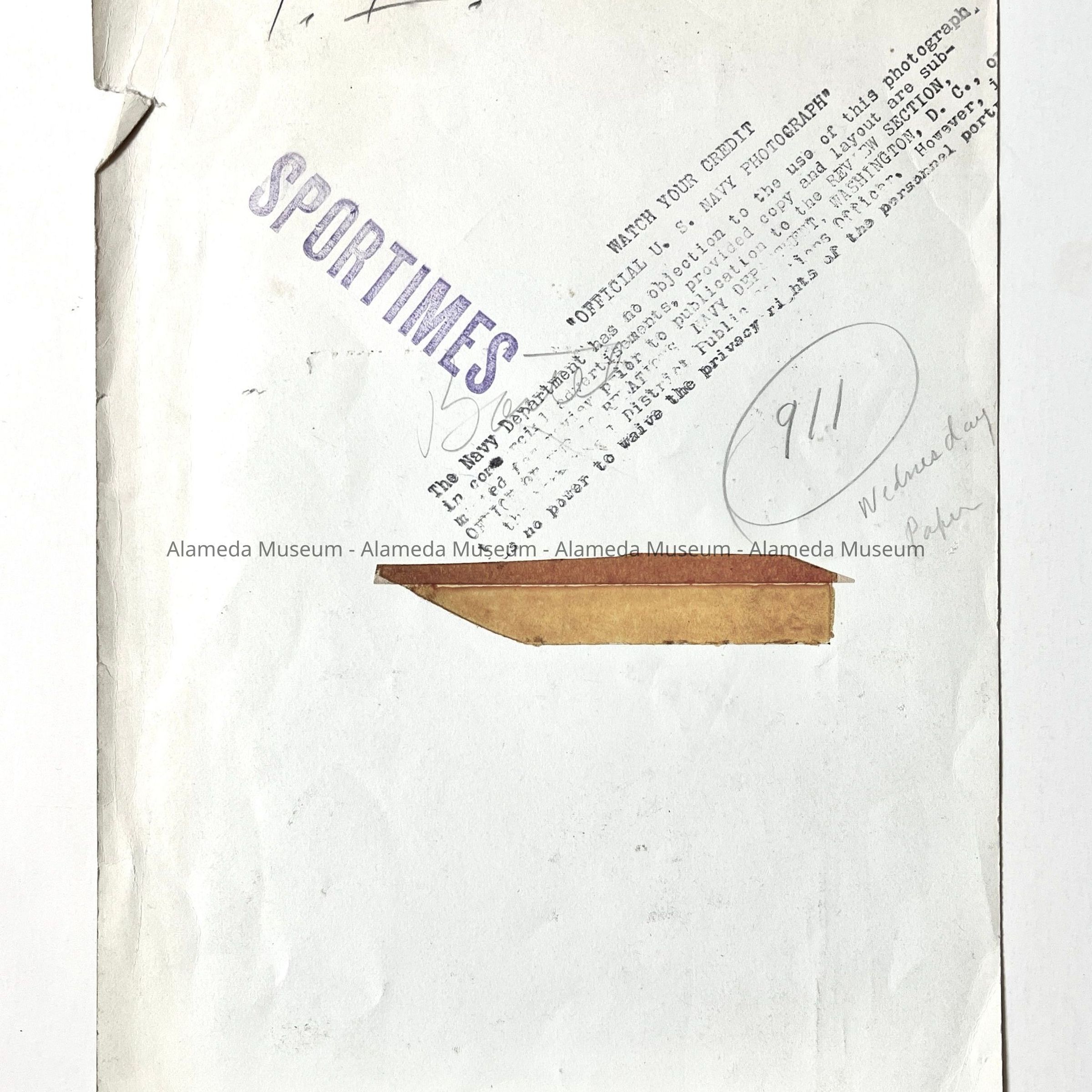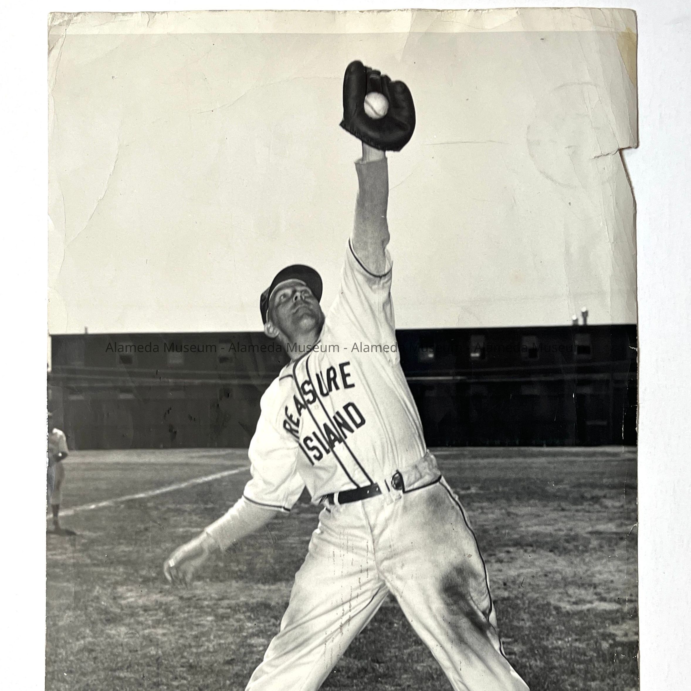 A PHOTOGRAPH OF THE NATIVE A LAMEDAN, DICK BARTELL, FAMOUS BALL PLAYER, AFTER WHOM BARTELL FIELD IN LINCOLN PARK WAS NAMED. HE IS SHOWN WEARING A UNIFORM, WITH THE WORDING, "TREASURE ISLAND," ON THE CHEST OF THE SHIRT.