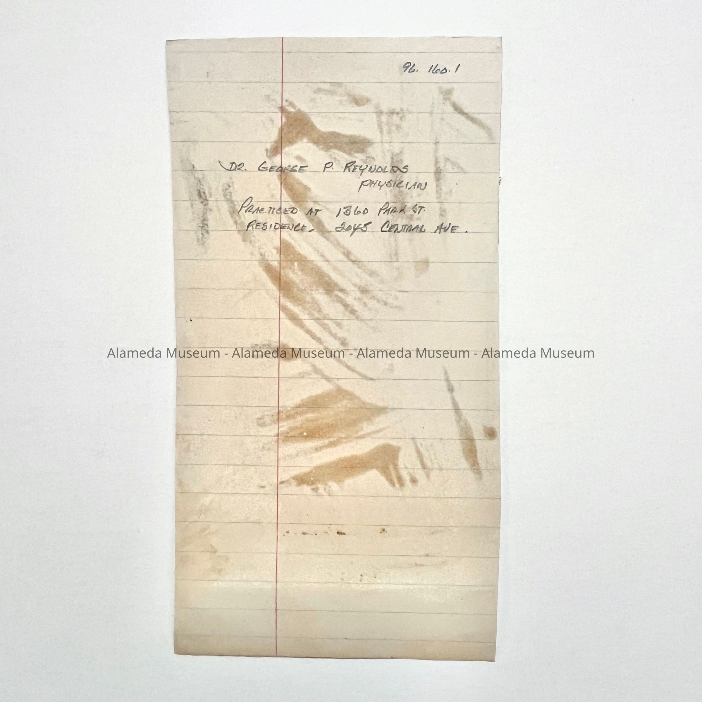History of Object: Portrait of Dr. George P. Reynolds, physician, who appears to be peeling potatoes for a picnic. He practiced at 1360 Park st., and resided at 2045 Central Avenue.