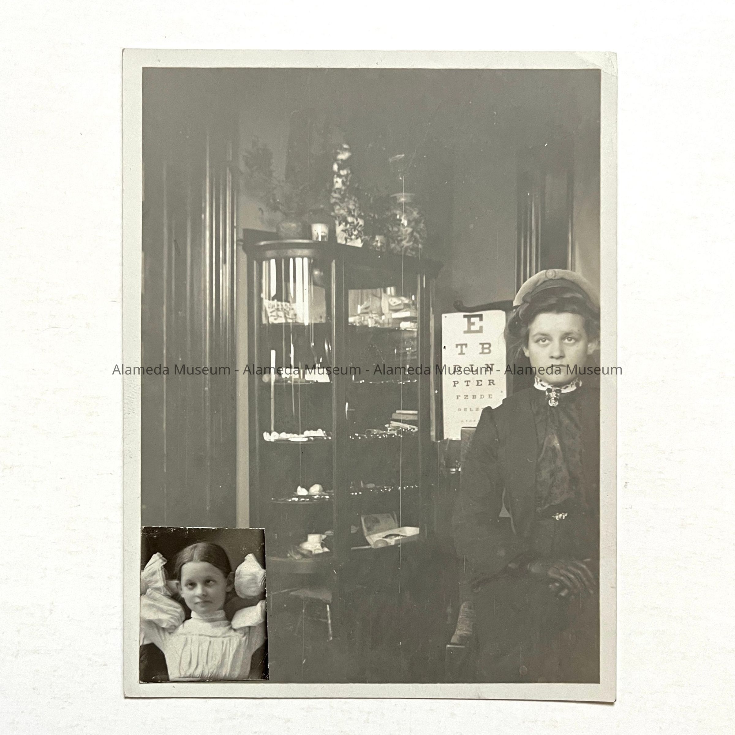 History of Object: A corner of Dr. W. Barclay Stephens examining room showing an eye chart and a glass-fronted display case, plus an unidentified woman standing by. A smaller photo of an unidentified girl is glued to the lower left corner.