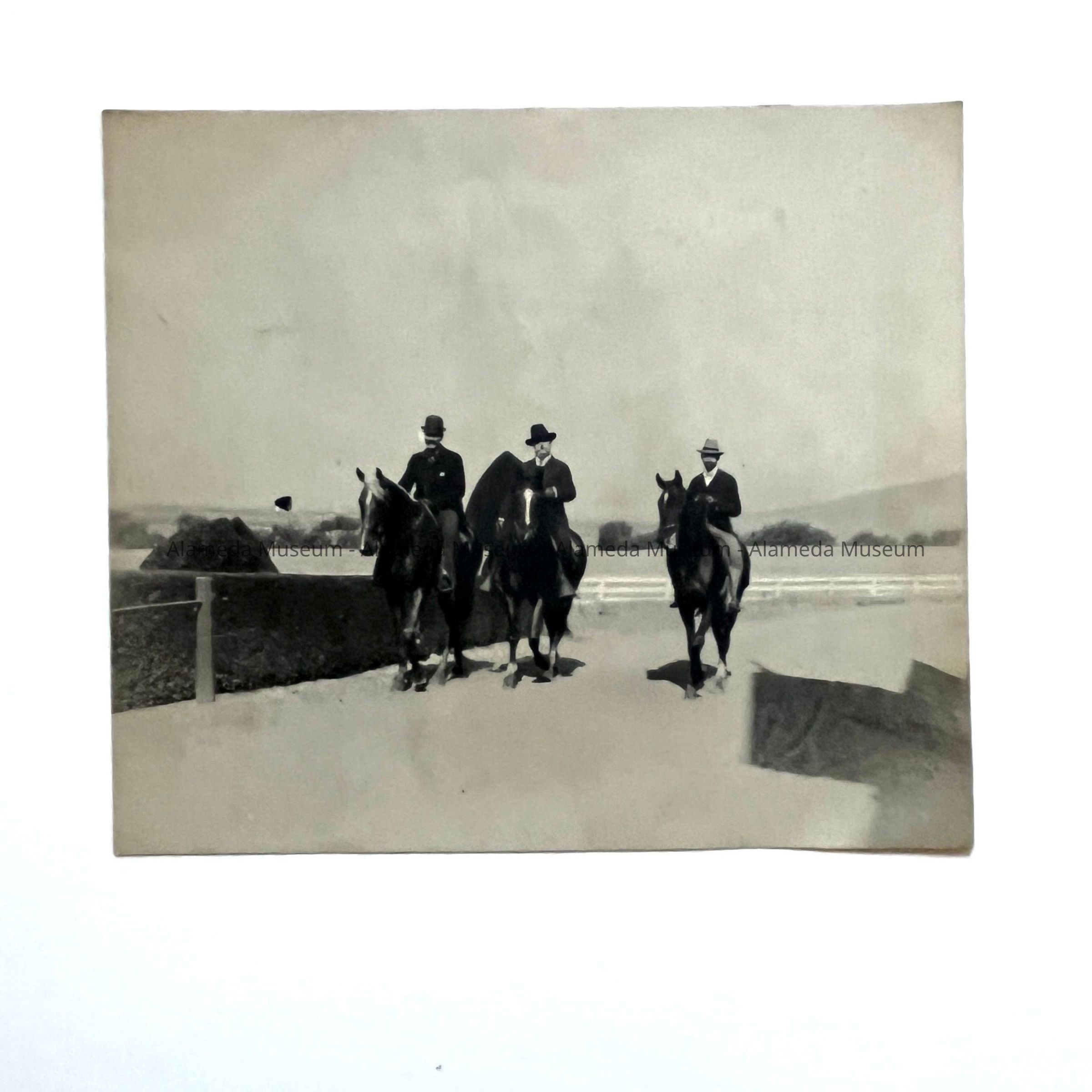 PHOTOGRAPH OF DR W B STEPHENS (WITH BEARD) AND DR REYNOLDS (CENTER), BOTH EARLY ALAMEDA PHYSICIANS. THEY ARE PICTURED WITH ANOTHER UNIDENTIFIED GENTLEMAN RIDING HORSES.