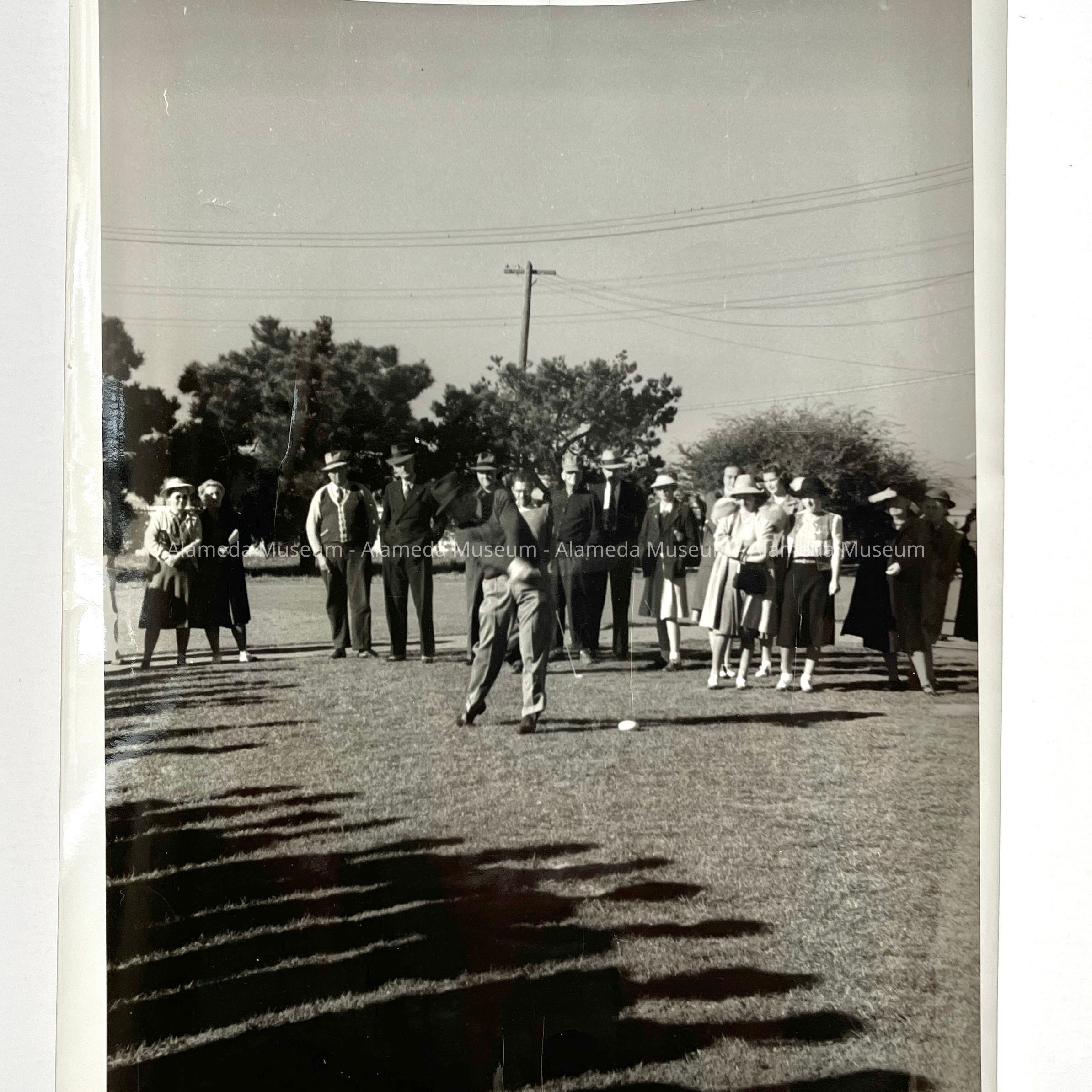 A PHOTOGRAPH OF EARL FRY, CHAMPION GOLFER, WITH SPECTATORS, AT THE ALAMEDA MUNICIPAL GOLF COURSE.