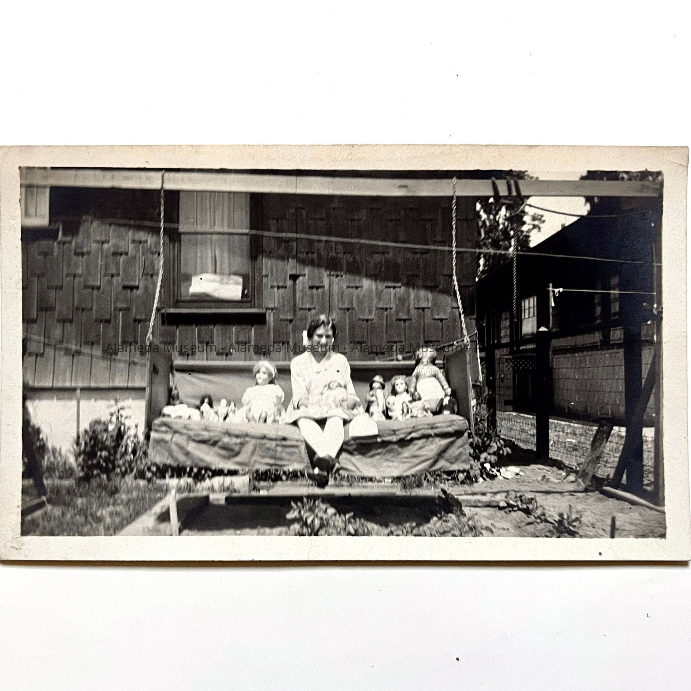 PHOTOGRAPH OF EILEEN KNIGHT, WITH HER DOLL COLLECTION, IN THE REAR YARD OF 1304 PARK AVENUE, ALAMEDA, CALIFORNIA.