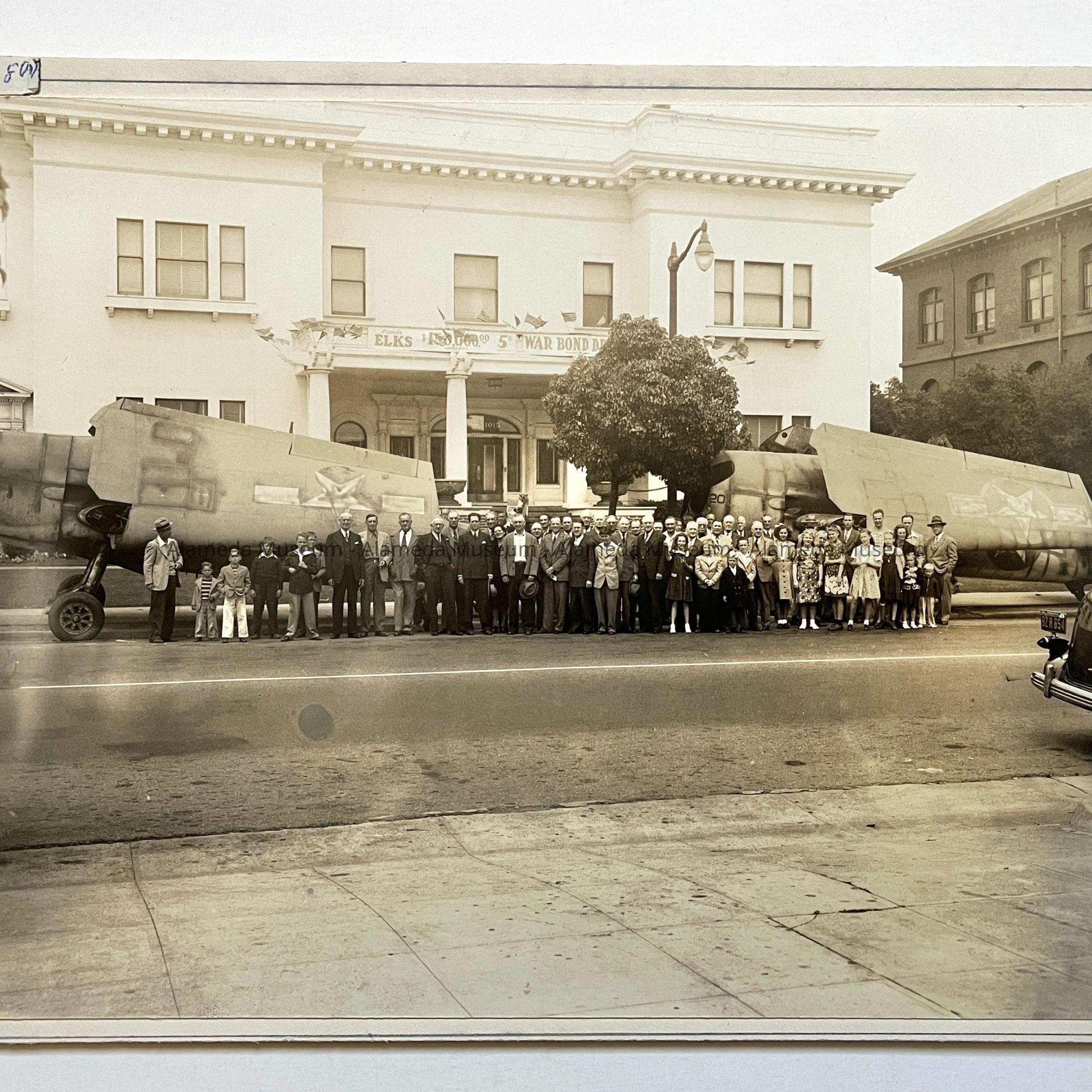 History of Object: Elks Club members with their families standing in front of two U.S. fighter planes on the street in front of the Lodge. This was to publicize Elks participation in the 5th War Bond Drive.